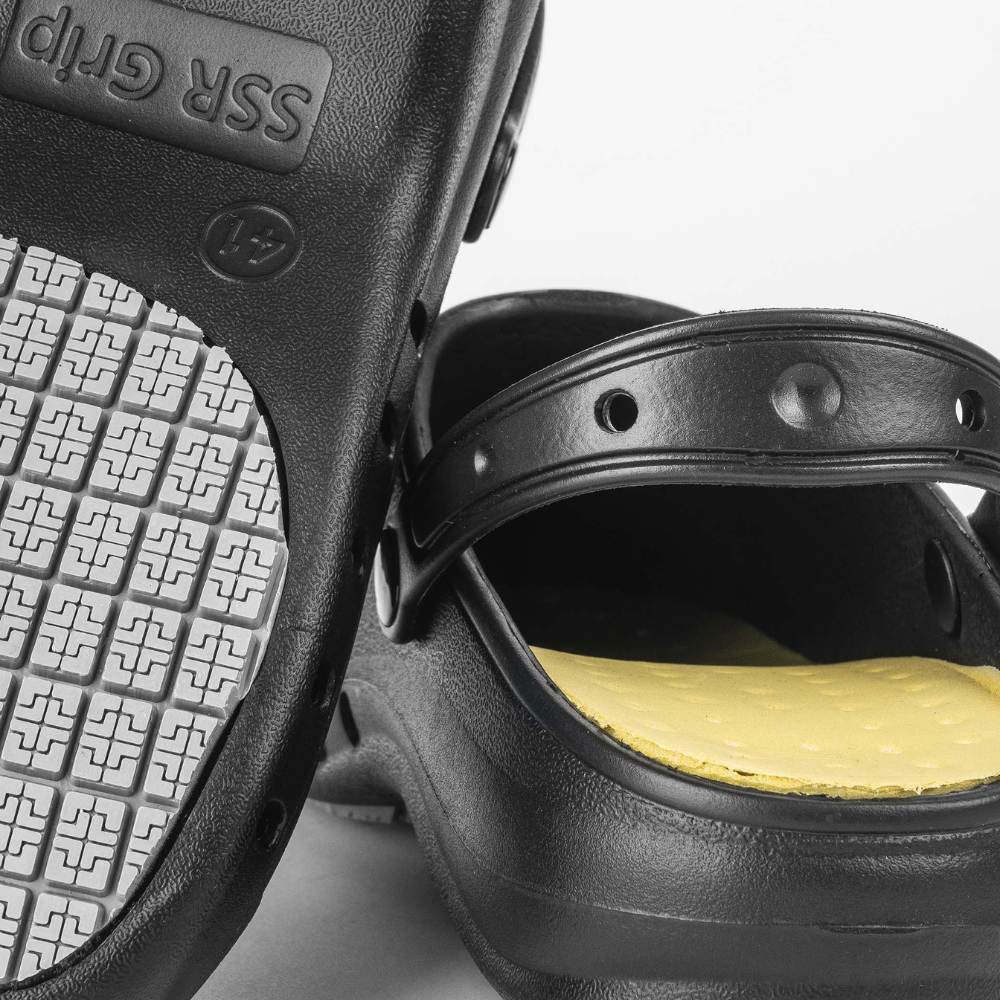 Mixed EVA clogs. Non-marking SSR GRIP rubber outsole. Front perforations for better water evacuation and breathability. Movable strap for perfect heel support. FootFlower EVA comfort sole, perforated, hydrophobic, quick-drying and odor-resistant.