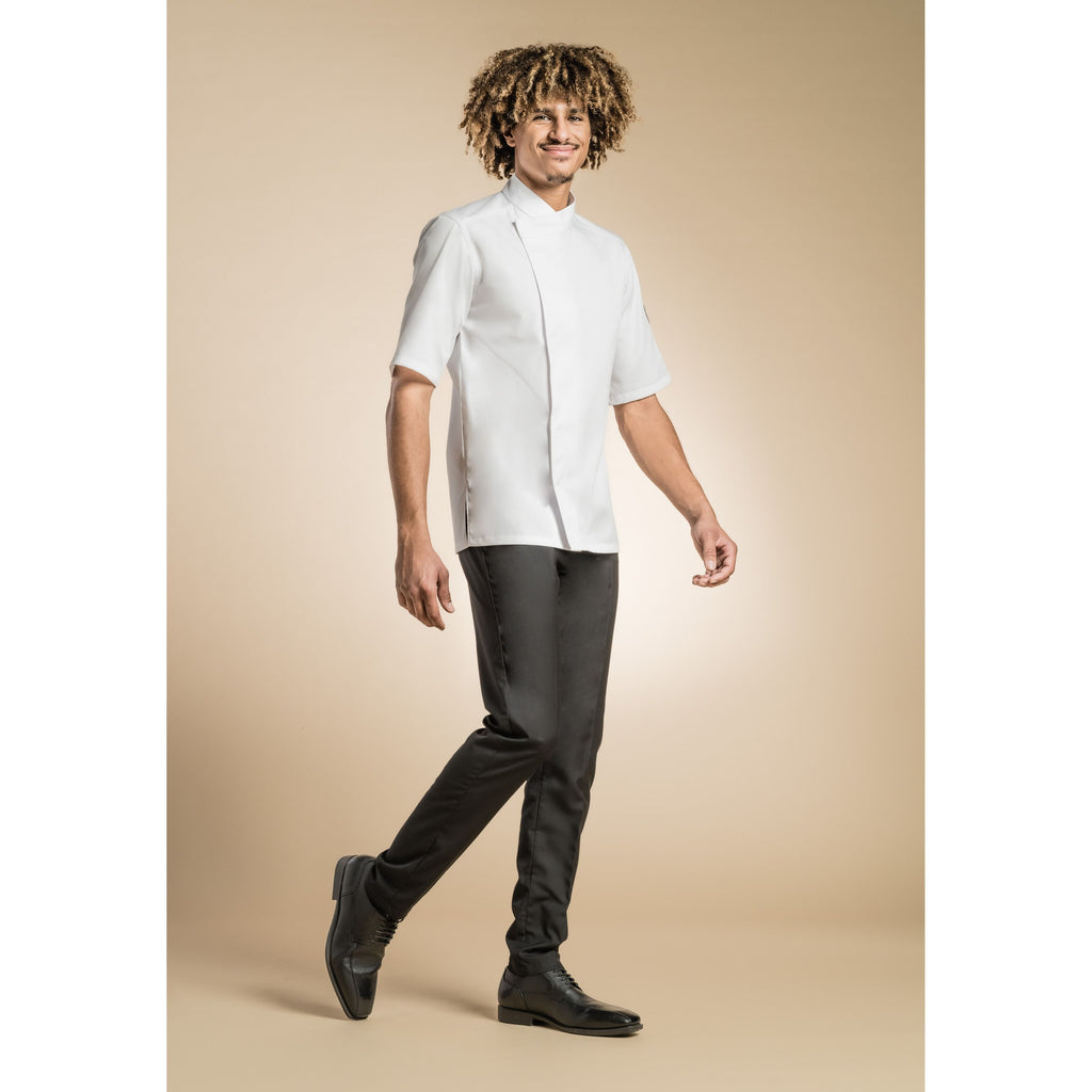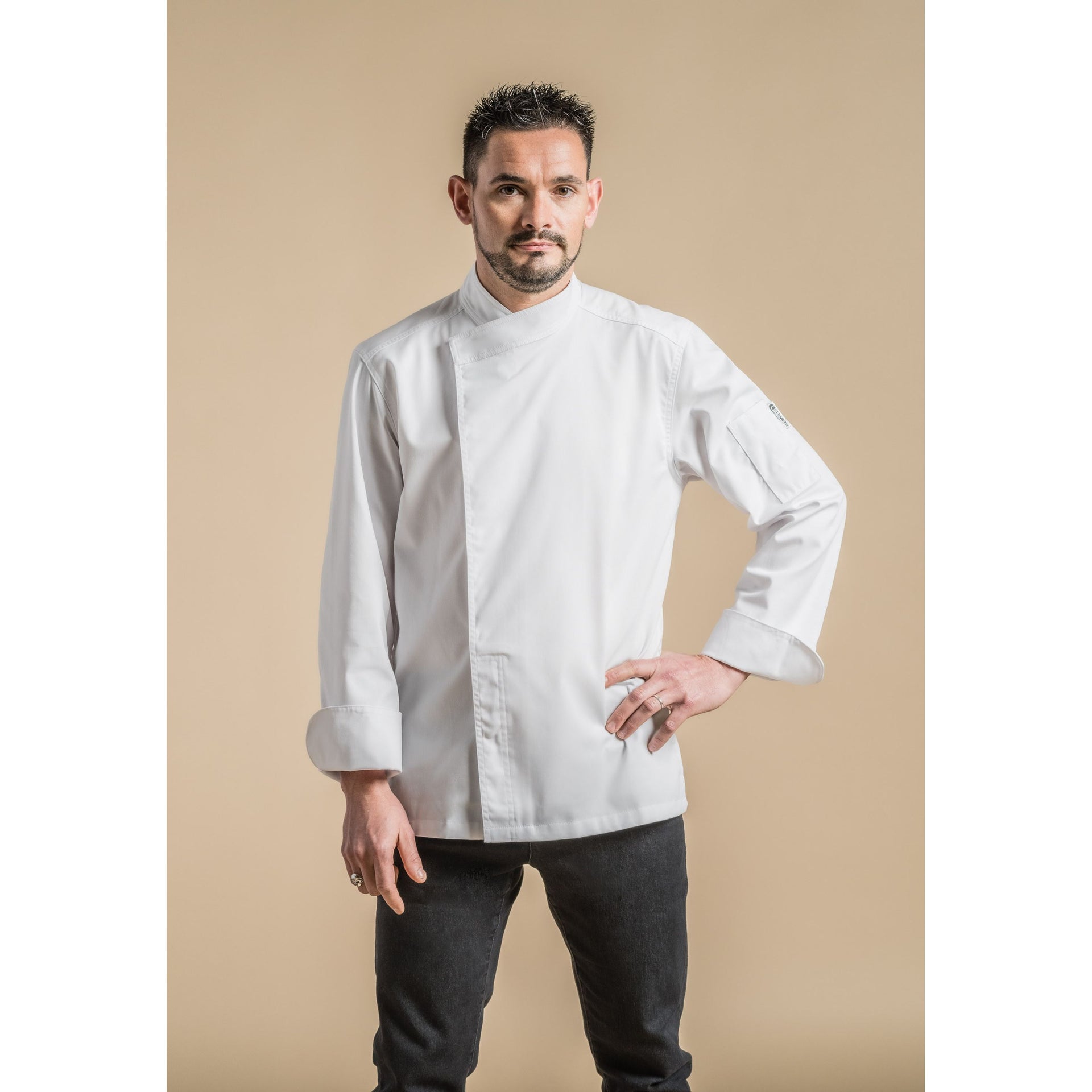 Men's chef's jacket with kimono collar. Hidden snaps. Pen pocket on left sleeve. Side slits. Fabric: 65% polyester, 35% cotton. Available in short or long sleeves, sizes 00 to 8.