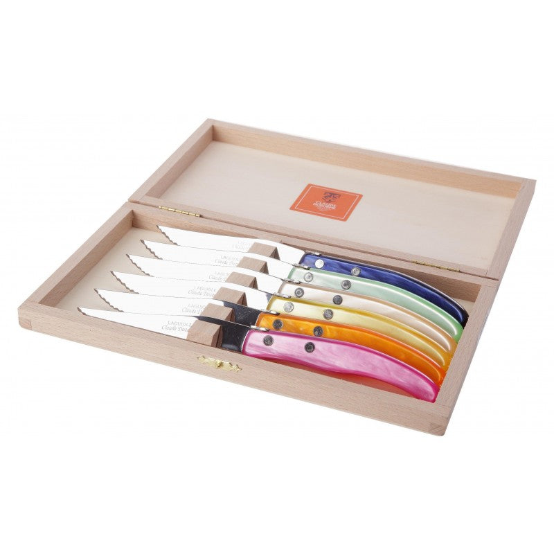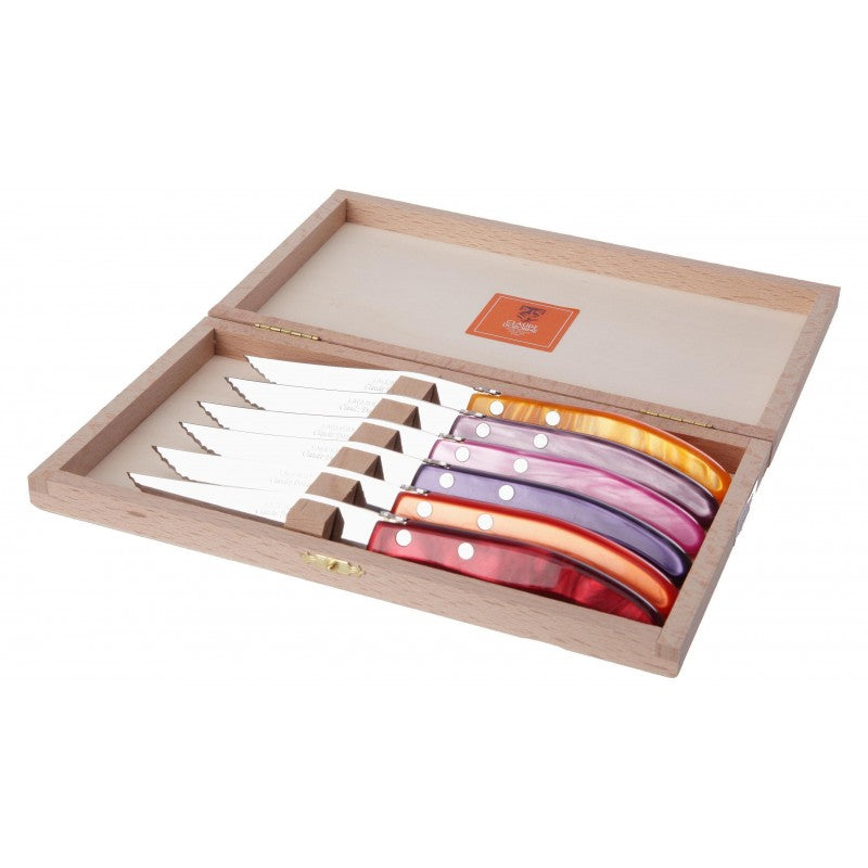 Wood box of 6 Berlingot knives mixed color resin handle