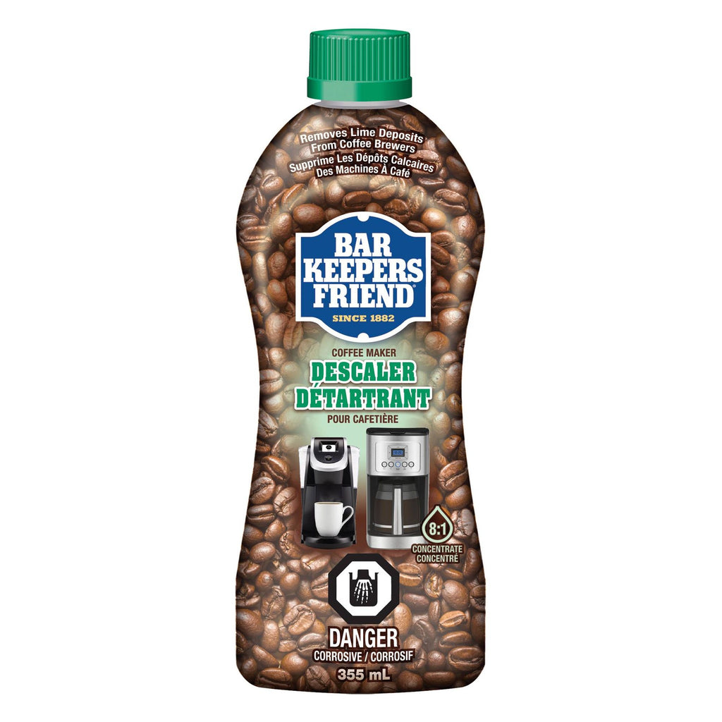 The Bar Keepers Friend coffee descaler comes in a convenient 12 oz bottle. This allows for multiple descalings throughout the year. All you need is 1 oz of descaler per 8 oz of water.