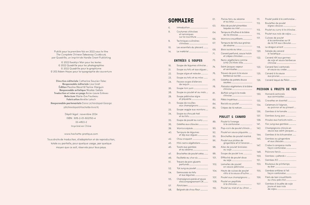 L'auteur propose dans ce livre 150 de ses recettes les plus populaires, de la salade de canard croustillant aux ribs BBQ sucrés, en passant par la soupe aux wontons et les crêpes roulées, le riz frit, les rouleaux de printemps et la soupe aigre-douce, ainsi que 50 recettes savoureuses que vous ne trouverez nulle part ailleurs.