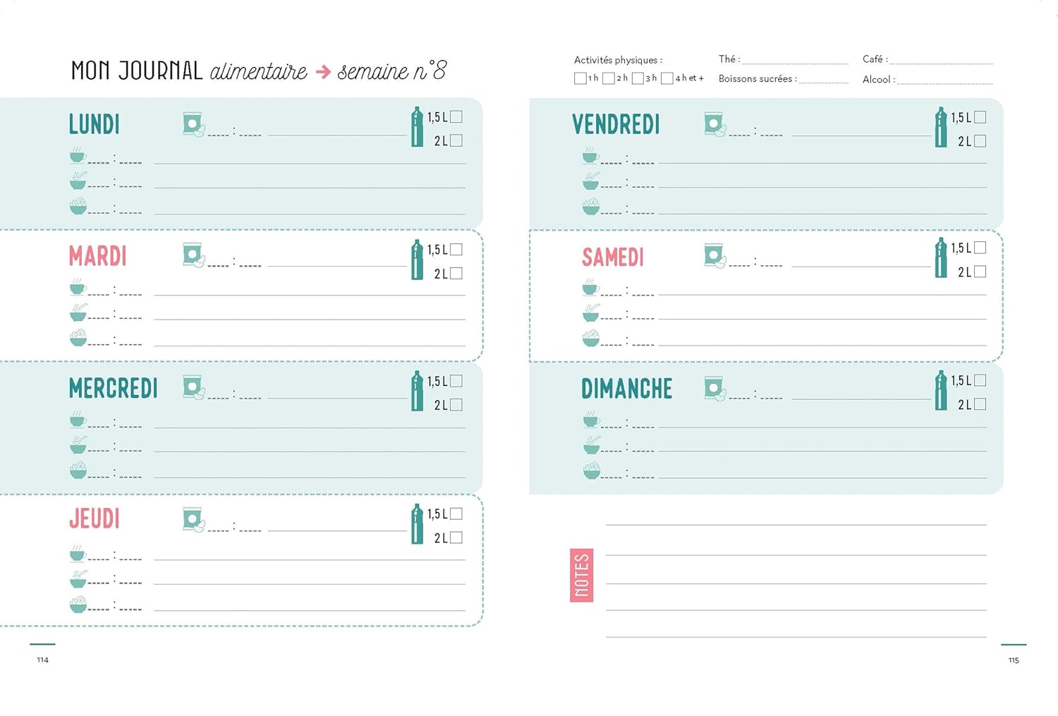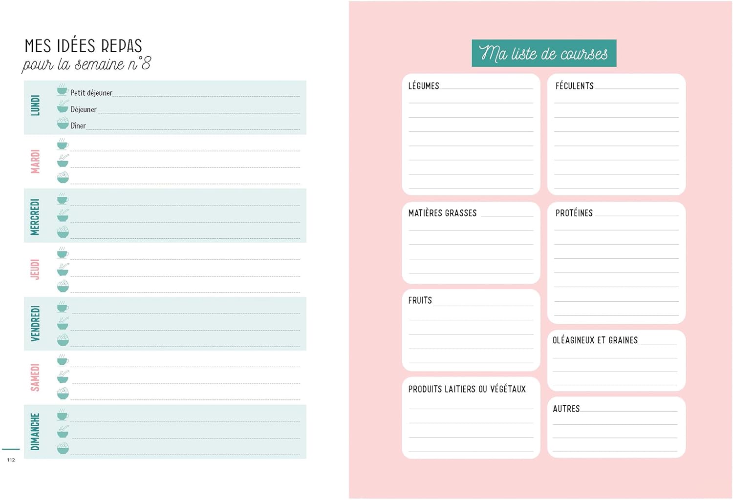 - Des espaces à remplir chaque semaine pour noter vos idées de repas, votre liste de courses et les repas quotidiens dans un journal alimentaire.