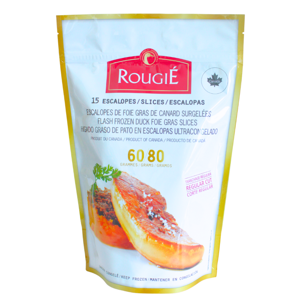 Rougié foie gras escalopes are the only ones that are frozen immediately after slaughter. They have a melting rate of less than 10% and a taste identical to refrigerated foie gras. Moreover, they are ideal for receptions since they can be pan-fried directly and reheated in the oven just before serving.