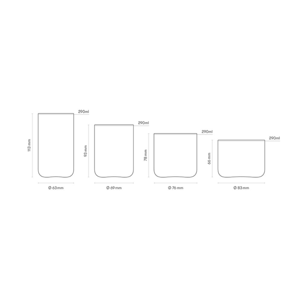 Despite the different shapes, the glasses hold exactly the same volume of 290 ml/9.8oz. Perfect for water, mocktails, cocktails, or as a gift set.
