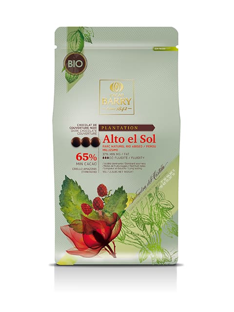 Couverture dark chocolate – 65% cacao. The Alto El Sol beans have a unique and exceptionnal personality. Ideal for fillings, moulding, couverture, cookies, mousses, decorations, sauces, ice creams.