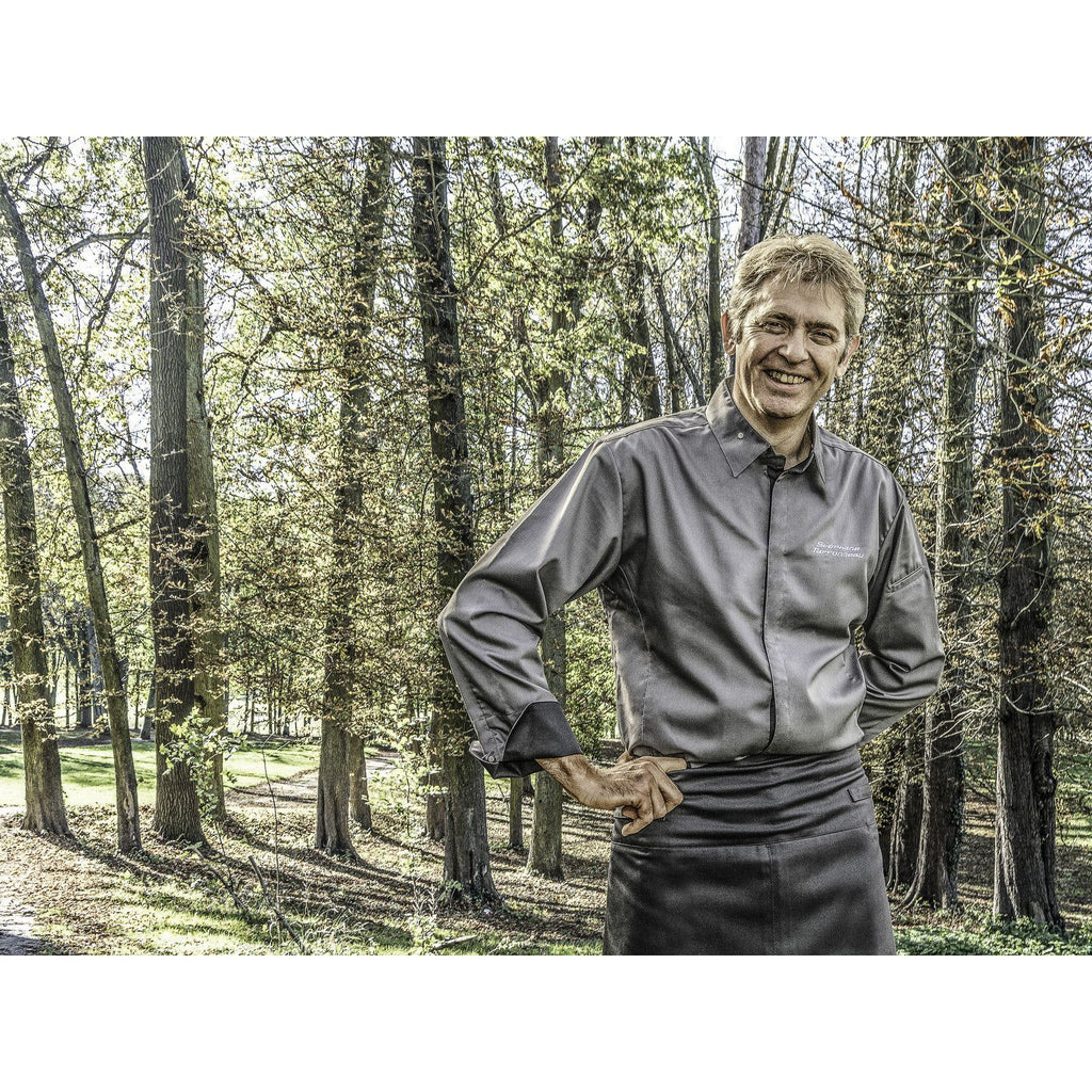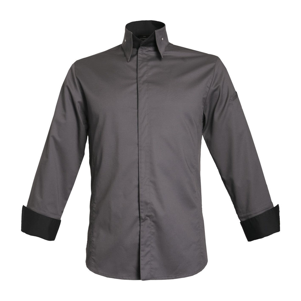 Chef's jacket and chef's jacket, shirt collar with matte stainless steel snap fasteners on collar and cuffs. Contrasting collar stand, inner bib band and inner cuffs. Hidden snap fasteners on bib, pen pocket on left sleeve, side slits.
