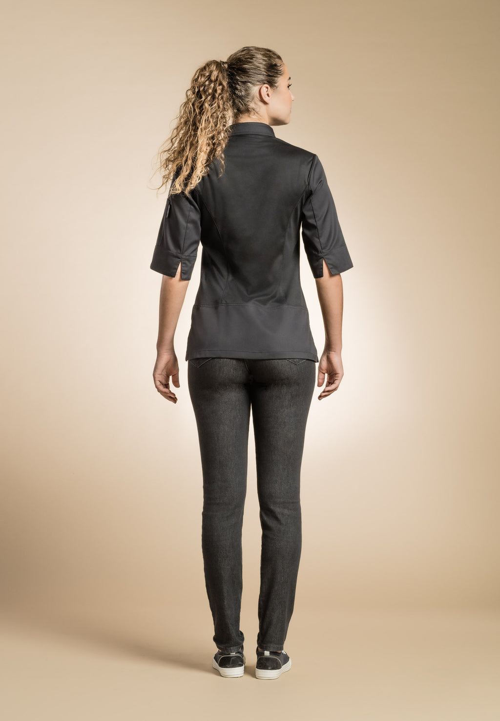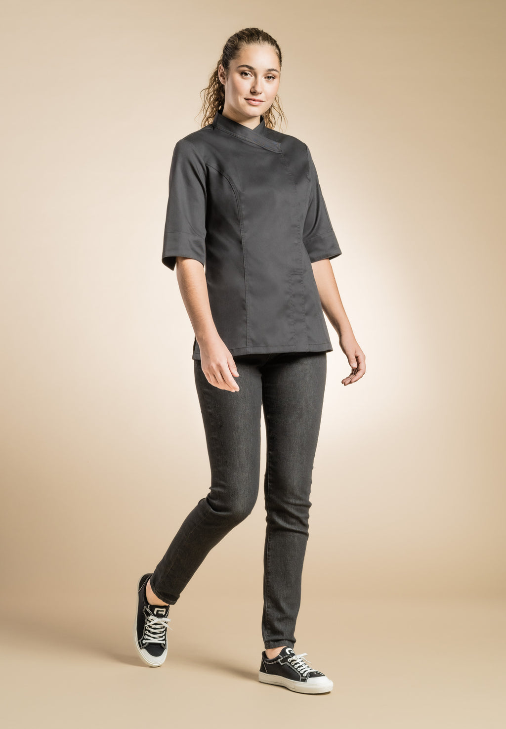 Women's chef's jacket with kimono collar, hidden snaps, pen pocket on left sleeve, side slits.