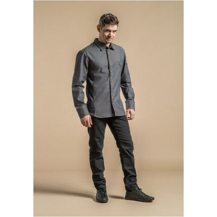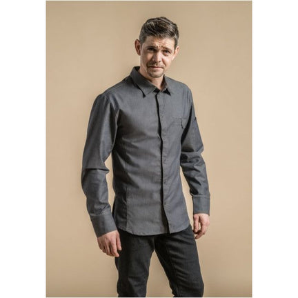 Men's denim chef jacket with a denim shirt collar. Metal snaps at the center front, cuffs, and chest pocket closure tab. Welt chest pocket, pen pocket on the left sleeve, and side slits.