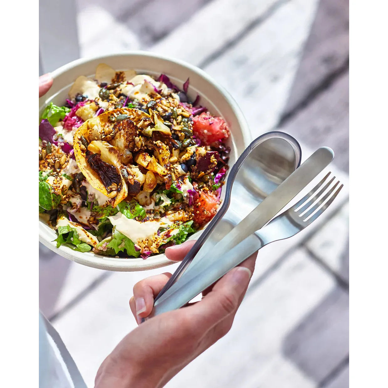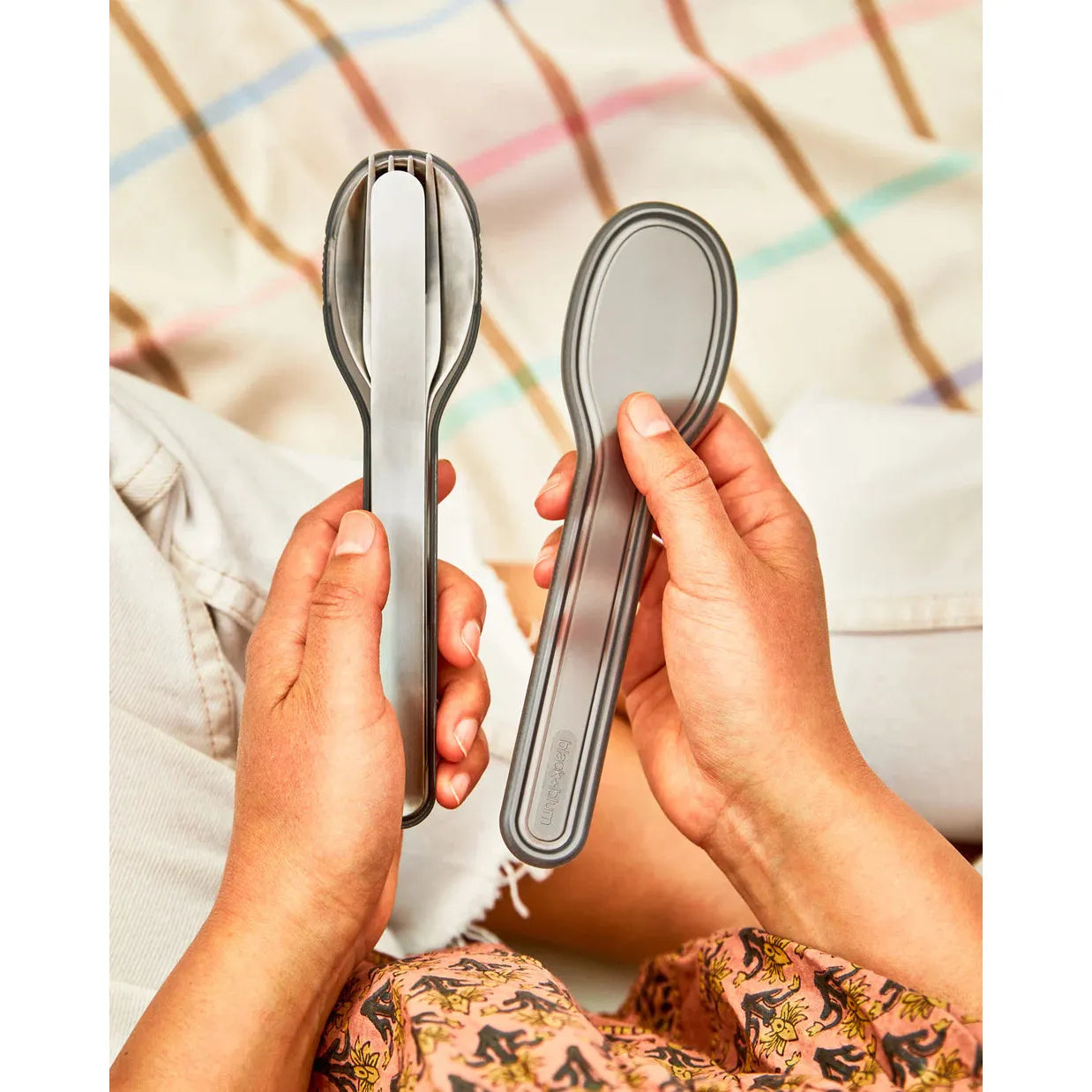 A nesting knife, spoon and fork set that feels great to hold and conveniently nests into a protective case for easy carrying.