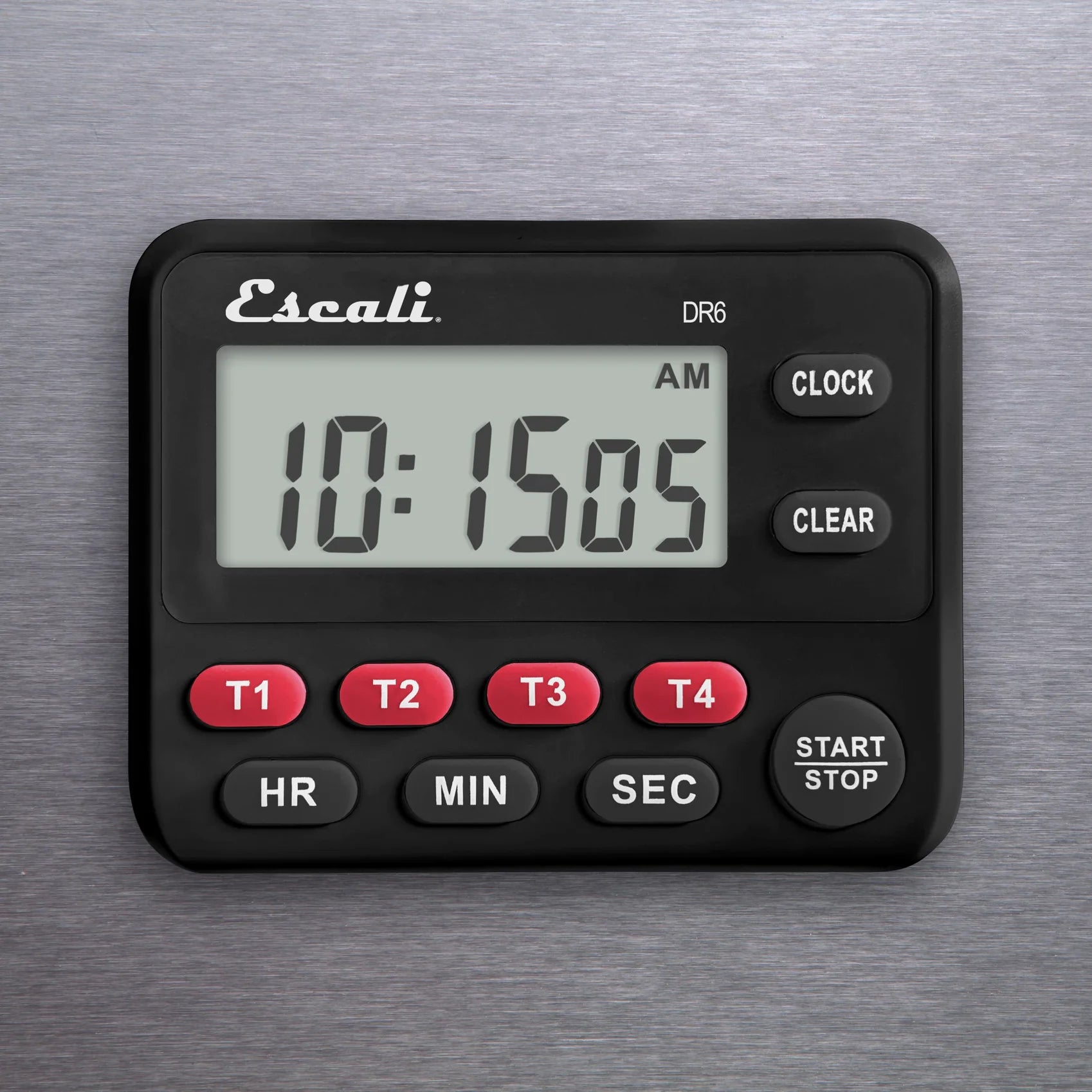 The Escali DR6 Four-Event Digital Timer lets you track up to four separate events simultaneously. Each timer channel can count up to 99 hours, 59 minutes, and 59 seconds. The timeout feature keeps track of elapsed time, and the recall function allows you to quickly reset the previous setting for repetitive tasks.