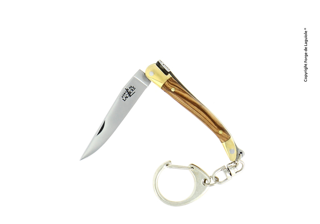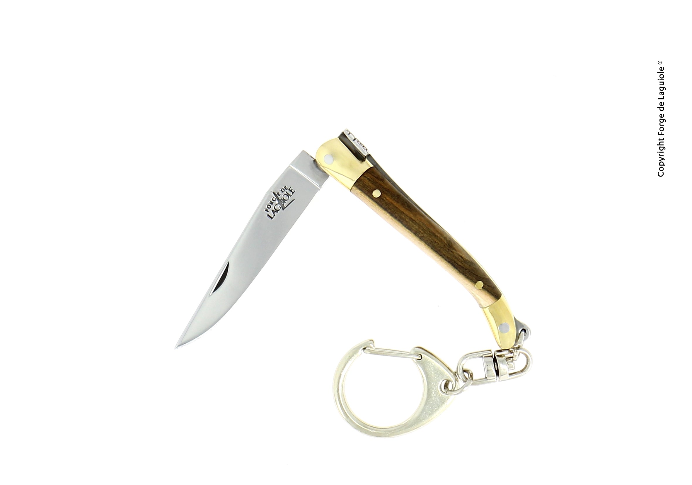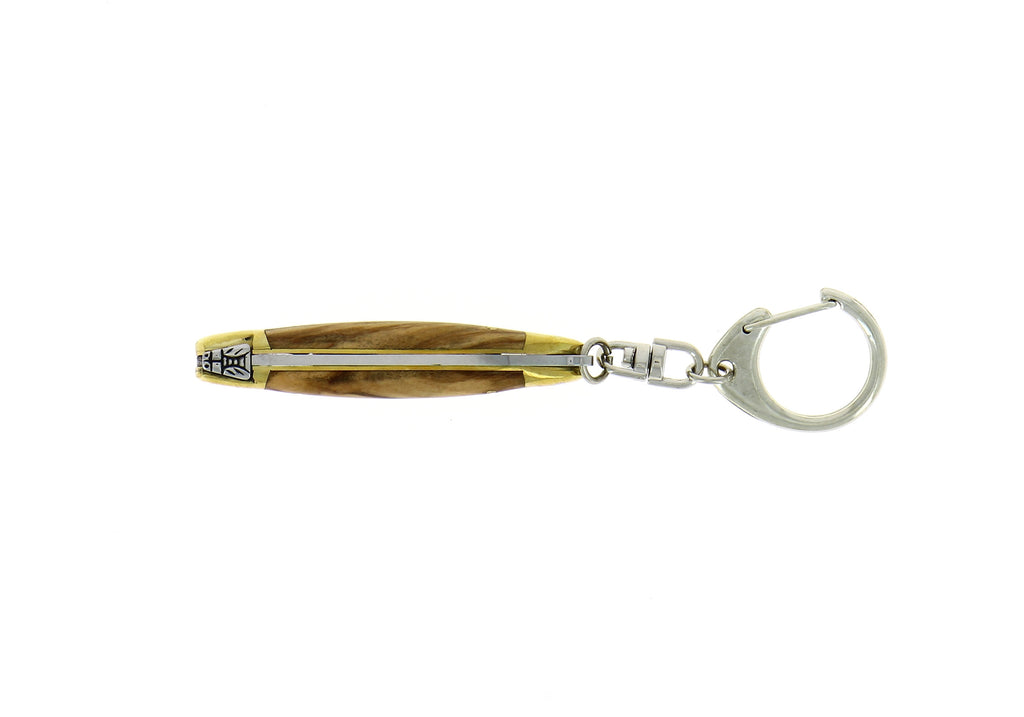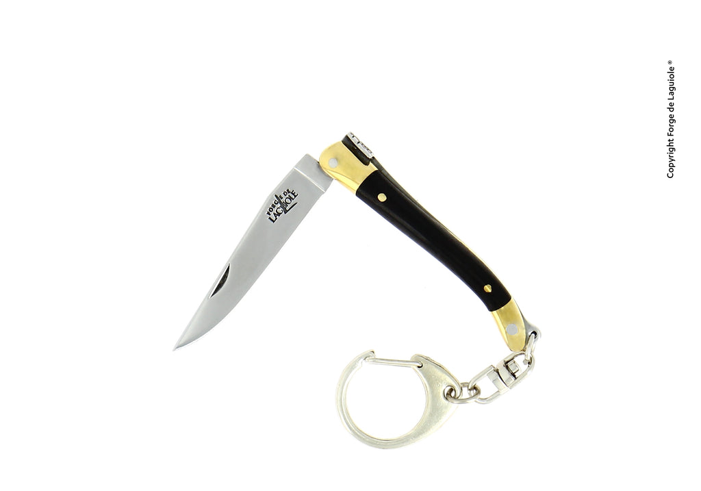 Small keychain knife from Forge de Laguiole with a single blade. It features two brass bolsters that protect the ends of the handle from everyday use.