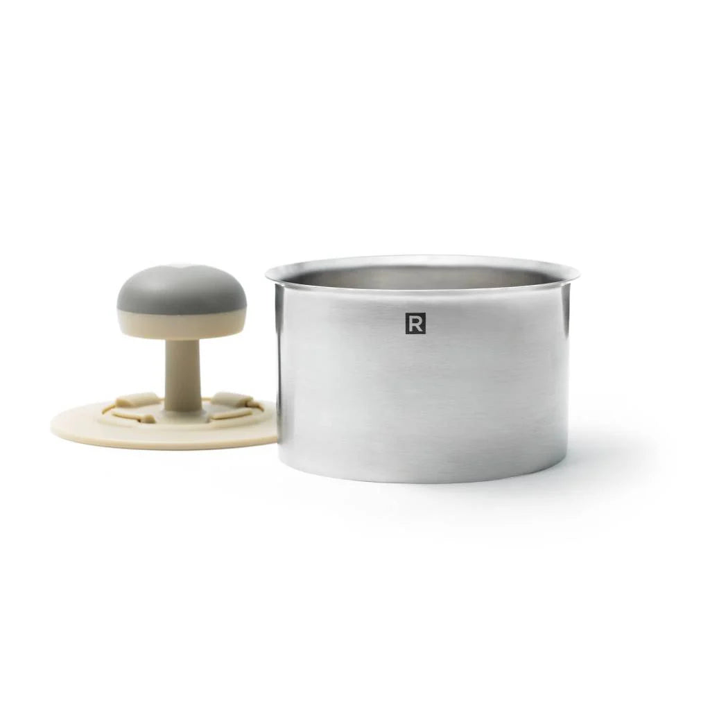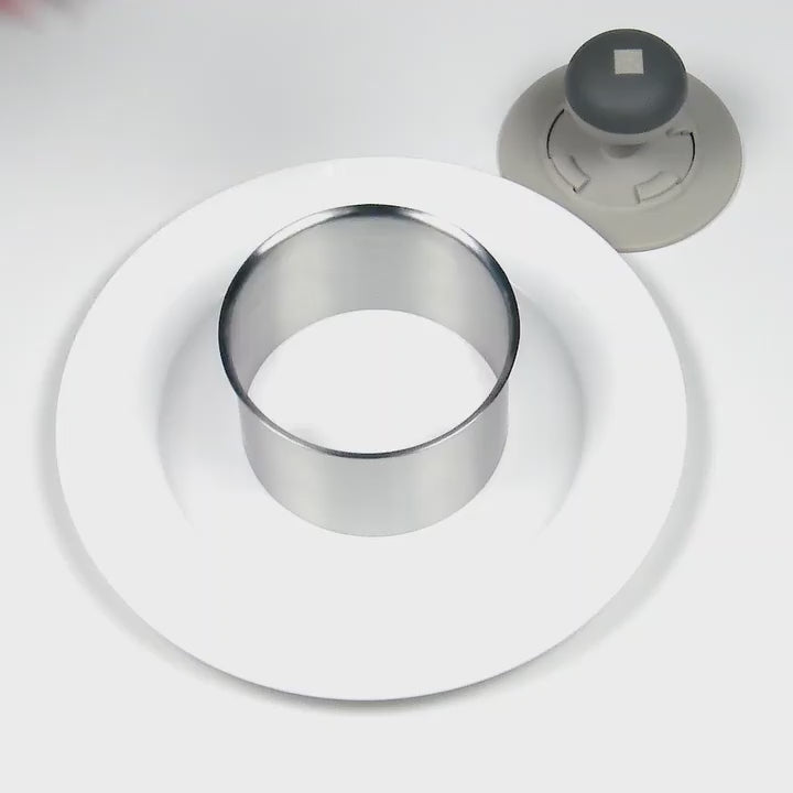 - Includes a stainless steel ring and a nylon press