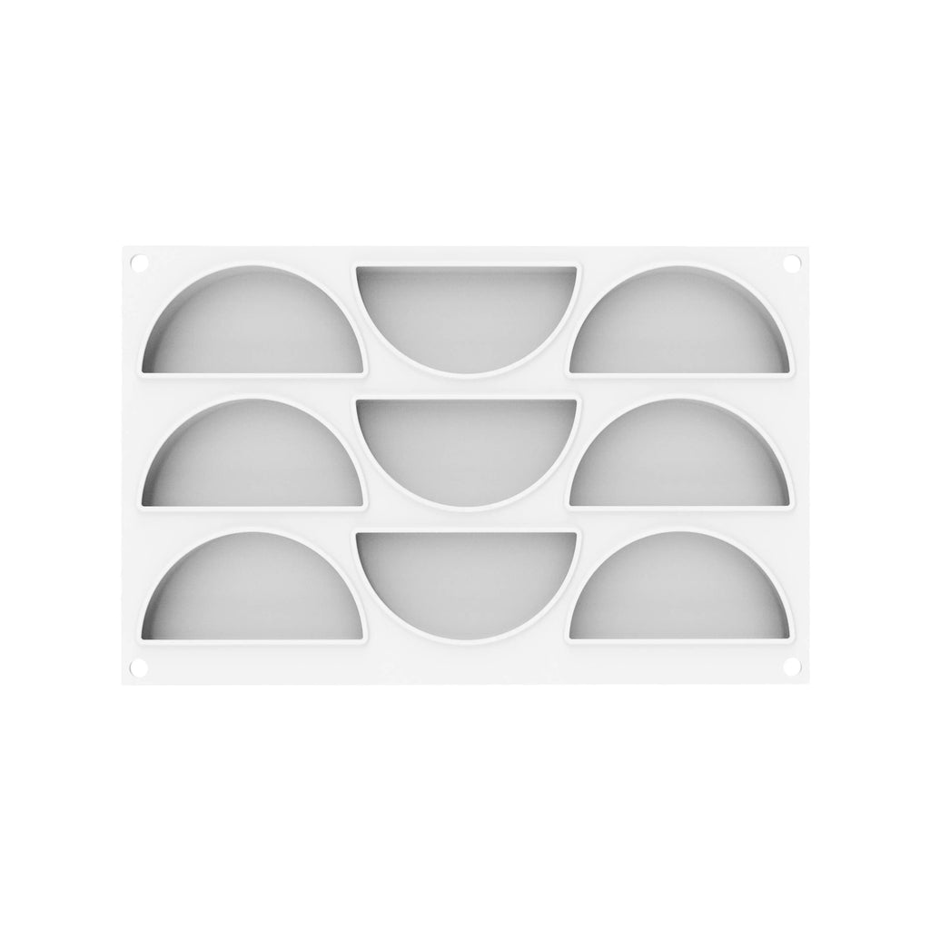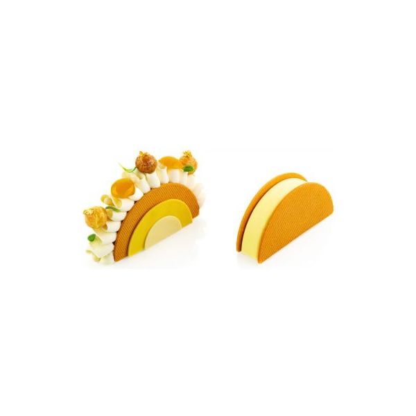 The Rainbow 80 consists of a silicone mold and a dual-purpose cookie cutter. The silicone mould is used to create the main body of the preparation (mousse/emifreddo/cake), while the cookie cutter is used to create shortcrust pastry/biscuits that perfectly fit the shape of the individual portion. The cookie cutter can also be used to make chocolate decorations (temper the chocolate, spread it between two sheets and then cut it).
