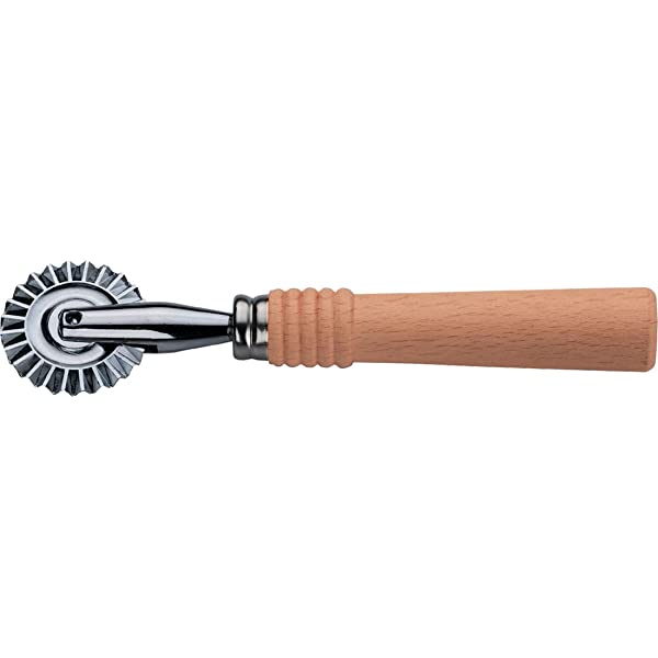 This fluted pastry wheel is used to make the familiar scalloped edges of lasagna, ravioli and farfalle (butterfly-shaped pasta), or to embellish the strips on a pie. This Ghidini pastry wheel has a 1.5-inch diameter wheel and 6.5 inches in length. Chrome with wooden handle. Made in Italy.
