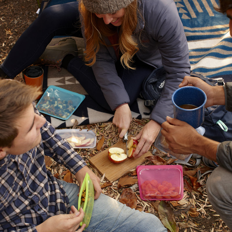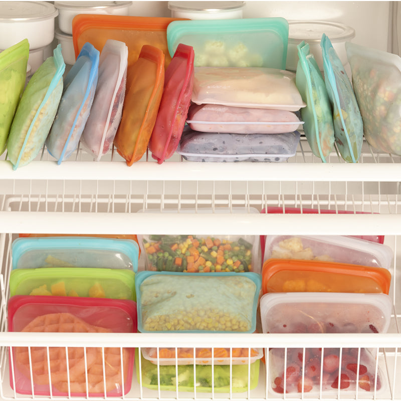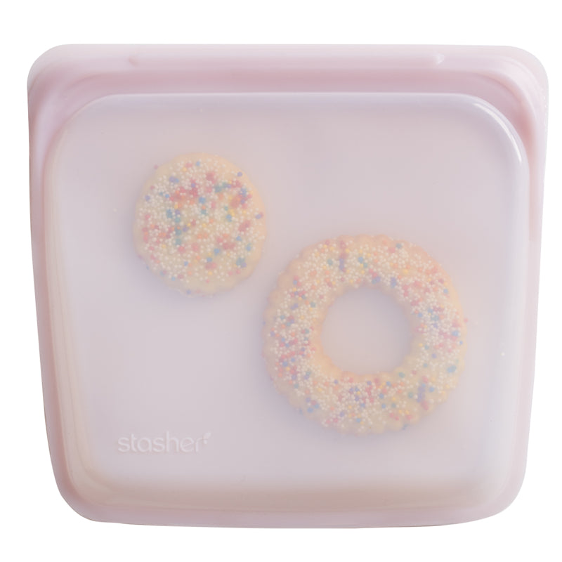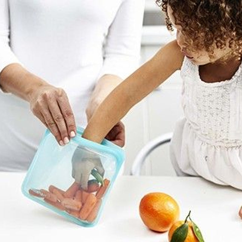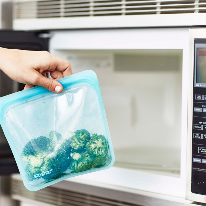 Reusable Storage Bag, with pinchpress seal , 7.25 x 7.5" (15oz) / 18.5 x 19cm (450ml), aqua, platinum silicone, BPA and BPS free. STASHER is the revolutionary alternative to plastic bags and containers. The innovative pinch press seal makes this ba g airtight and leakproof. Ideal for food, travel, school and more. Made of 100% pure platinum food-grade silicone, STASHER offers all the ease and convenience of plastic storage bags, but without the harmful effects. Unlike plastic bags, stasher contains no petroleum, no PVC and no latex, so it's good for us and our planet. This easy-to-clean, reusable bag i s freezer, microwave and dishwasher safe.