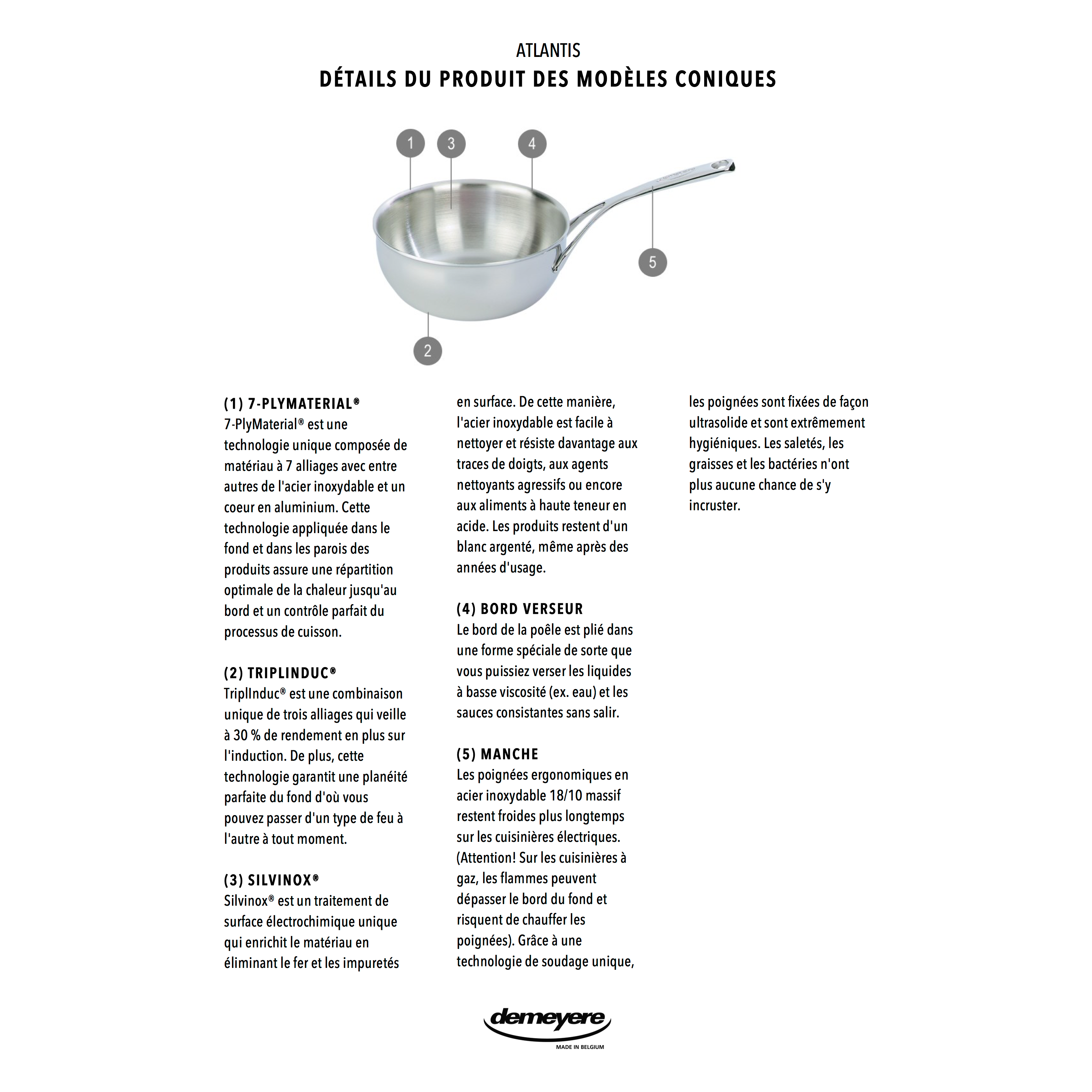 This lidded Atlantis saucepan is certain to impress. Soup, stew, vegetable dishes and sides are just some of the dishes that can be cooked quickly and gently in this pan, which has a base made from seven layers of heat-conducting steel. The pan's handles are made from cast 18/10 stainless steel, which remains relatively cool during cooking so that the pot can be handled without the need for gloves, even if used on an electric hob for a long time. The stainless steel sides, multi-layer InductoSeal base and tight-fitting lid are an unbeatable combination. The base, which comprises a copper middle layer and hermetically welded casing, ensures that heat is distributed as evenly and as effectively as possible. The exceptional magnetic properties of the pan's TriplInduc technology make this lidded saucepan ideal for use with induction hobs. The lidded saucepan also has a Silvinox finish. This specially-developed electrochemical treatment enhances the metal, removes residual iron and other surface impurities and helps it to retain its characteristic silver look even after many years of use. The saucepan is easy to clean and the resilient surface is exceedingly resistant to unsightly fingerprints. Surprise your guests with delicious dishes cooked up in this lidded Demeyere saucepan.