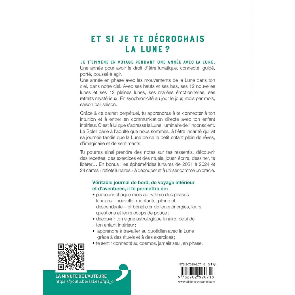Une année pour avoir le droit d'être lunatique, connecté, guidé, porté, poussé à agir. Une année en phase avec les mouvements de la Lune dans ton ciel, dans notre ciel. Avec ses hauts et ses bas, ses 12 nouvelles lunes et ses 12 pleines lunes, ses marées émotionnelles, ses retraits mystérieux. En synchronicité au jour le jour, mois par mois, saison par saison. Grâce à ce carnet perpétuel, tu apprendras à te connecter à ton intuition et à entrer en communication directe avec ton enfant intérieur. C'est à lui que s'adresse la Lune, luminaire de l'inconscient. Le Soleil parle à l'adulte que nous sommes, à l'être incarné qui vit sa journée tandis que la Lune berce le petit enfant plein de rêves, d'imaginaire et de sentiments. Tu pourras ainsi prendre des notes sur tes ressentis, découvrir des recettes, des exercices et des rituels, jouer, écrire, dessiner, te libérer... En bonus : les éphémérides lunaires de 2021 à 2024 et 24 cartes " reflets lunaires " à découper et à utiliser comme un oracle. Véritable journal de bord, de voyage intérieur et d'aventures, il te permettra de : parcourir chaque mois au rythme des phases lunaires - nouvelle, montante, pleine et descendante - et bénéficier de leurs énergies, leurs questions et leurs coups de pouce ; découvrir ton signe astrologique lunaire, celui de ton enfant intérieur ; apprendre à travailler au quotidien avec la Lune grâce à des rituels et à des exercices ; te sentir connecté au cosmos, jamais seul, en phase.