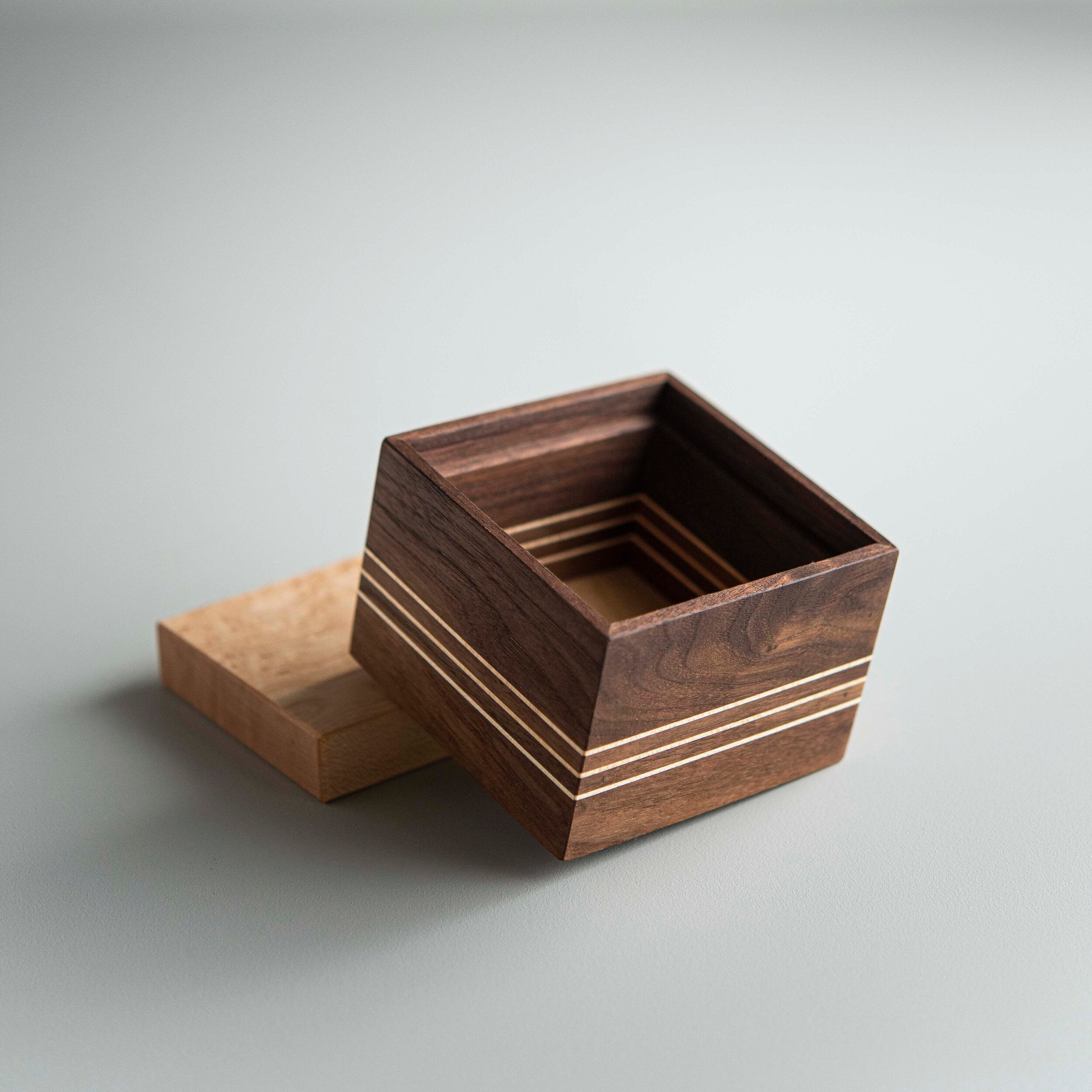Ces mains de sel sont particulièrement élégantes sur votre table, comme sur votre comptoir. Fait de noyer avec un détail de trois lignes d'érable contrastante, cette petite boîte a un look très minimaliste. Certains de nos clients utilisent ces boîtes en bois pour stocker du thé, du sel, du poivre, des épices ou comme boîte à bijoux.