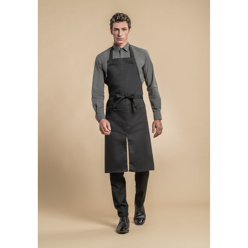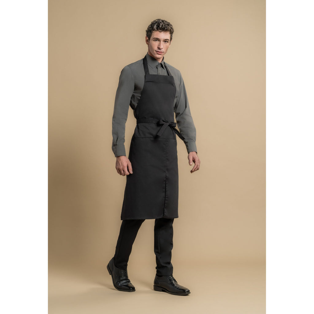 Tablier à bavette avec fente milieu devant, poche soutane sous ceinture, passant pour liteau. Les liens de taille et le lien de cou laissent plus de souplesse aux mouvements grâce à un système d’élastiques cachés.