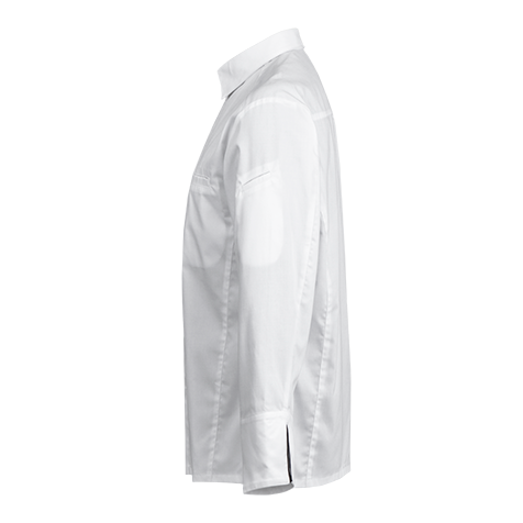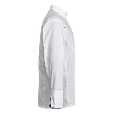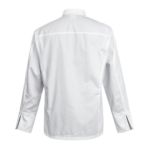 Veste de cuisine et veste de chef homme col chemise, garniture contrastée intérieur col et plastron + fentes poignets. Pressions cachées, poche poitrine passepoilée, poche stylo manche gauche, fentes côtés.