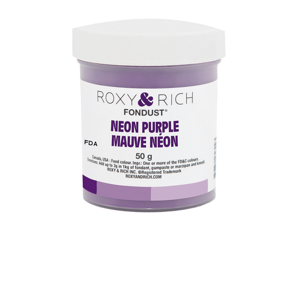 Fondust est un colorant génial pour tout pâtissier! Il s’agit du seul colorant hydrosoluble en poudre utilisable directement dans les aliments. Couleur Mauve Néon