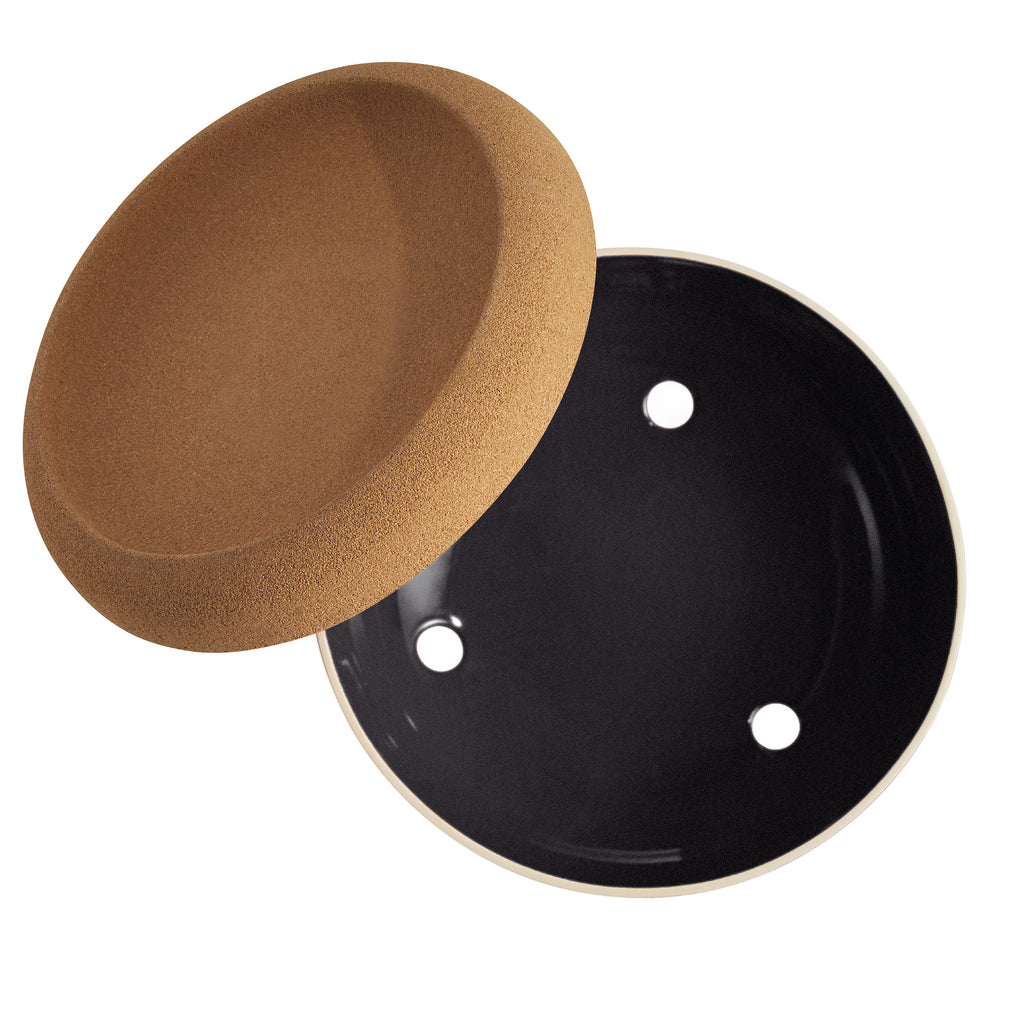 Sous le couvercle, l’absence de lumière permet de retarder la germination. Comme la céramique et le liège aident à réguler le taux d’humidité, avec ses 3 petites ouvertures qui assurent une ventilation idéale, la base de la Grande Coupe recrée les conditions d’une micro cave au cœur de votre cuisine ou votre salle à manger.