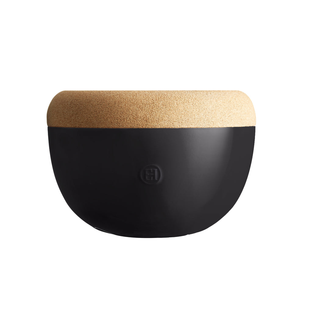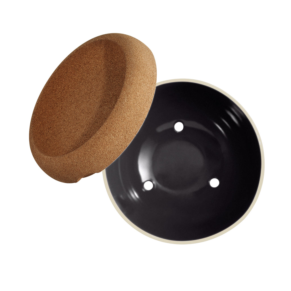 Cette coupe de conservation présente élégamment les plus beaux fruits dans sa coupelle en liège, tout en préservant dans sa base en céramique — à l’abri des regards — oignons, betteraves ou pommes de terre.