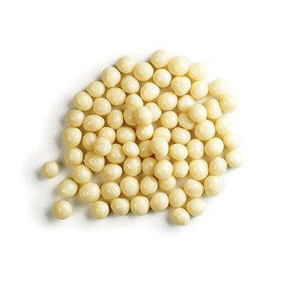 Petit en taille, mais géant en goût. Ces perles croquantes de chocolat blanc sont comme de minuscules billes de caviar : diamètre de 2 à 3 mm, à l'arôme et au goût superbe. Le noyau de chaque perle est composé d'un biscuit grillé. Il donne à la perle un croquant surprenant qui persiste. Simplement irrésistibles par elles-mêmes ou comme décoration raffinée sur les marmelades, glaçages et chocolats, ou pour des pâtisseries texturées telles que panna cotta et crème brûlée, ou encore dans les crèmes glacées ou mousses!