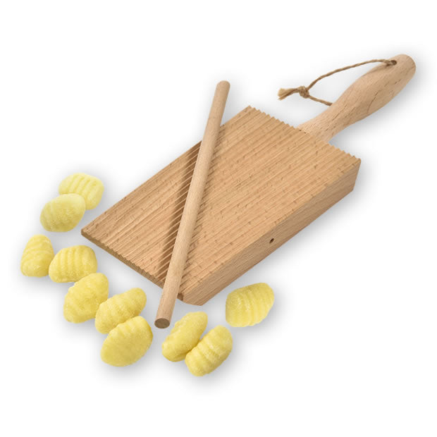La grande planche à gnocchi et garganelli avec épingle biseautée intégrée de Sara Cucina est fabriquée en bois de hêtre massif et mesure 8″ x 3.2″.