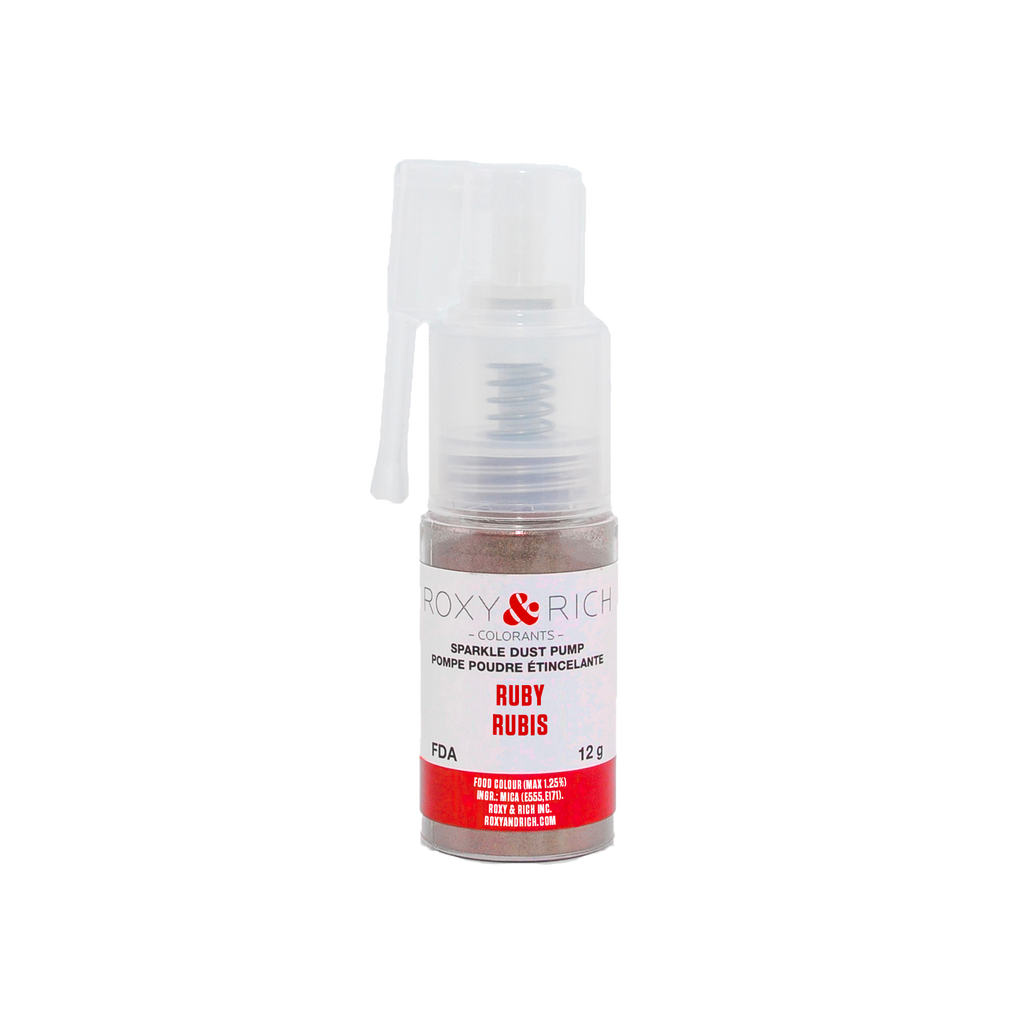 La couleur est obtenue en ajoutant une fine couche de colorant alimentaire sur les particules de mica. Cette façon de faire permet une brillance exceptionnelle qui surpasse les autres poudres lustrées offertes sur le marché. Les Pompes pour poudres étincelantes s’utilisent simplement en vaporisant sur le fondant, la glace royale, le chocolat et bien plus.