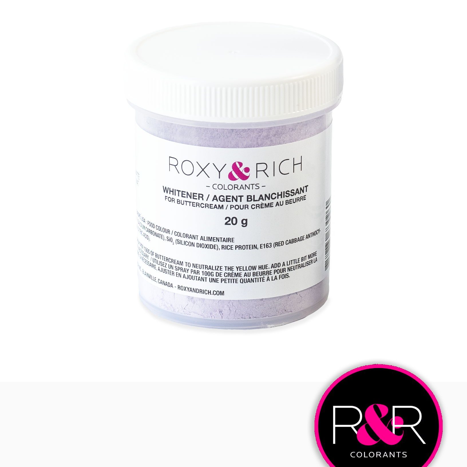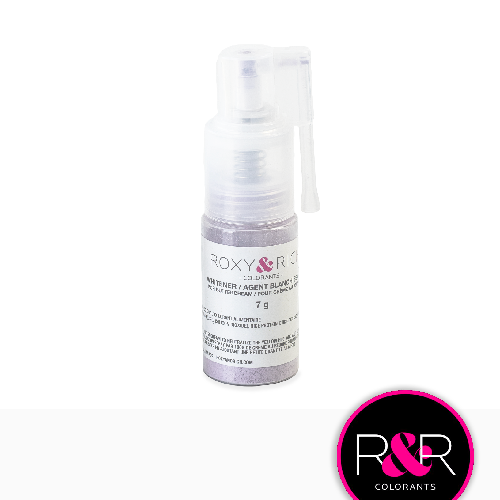 Nous vous recommandons d’utiliser un spray par 100 grammes de crème au beurre pour éliminer la teinte jaune. Vous devrez peut-être en utiliser un peu plus en fonction de l’intensité de la couleur jaune de votre mélange. Pour éviter que votre crème au beurre ne vire au gris ou au violacé, il est important de bien mélanger entre chaque vaporisation supplémentaire pour éviter un excès de poudre.