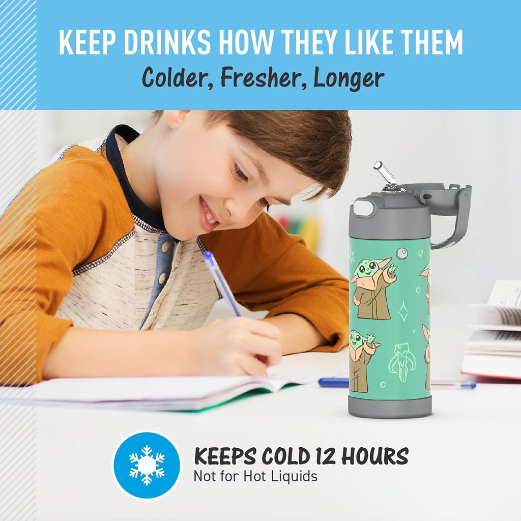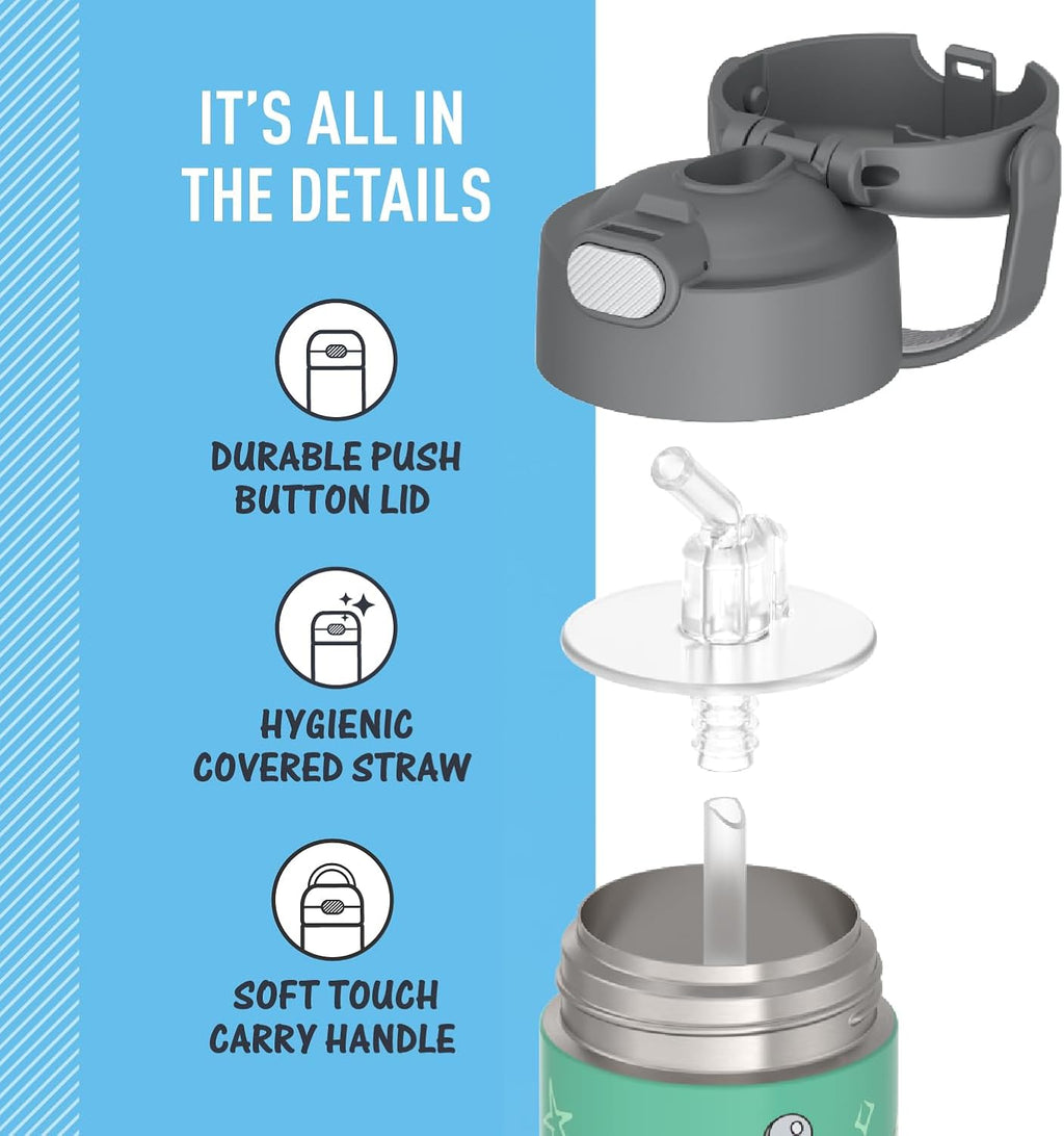 La bouteille d'eau Thermos en acier inoxydable isolée sous vide FUNtainer 410ml avec paille garde les boissons froides jusqu'à 12 heures. La construction en acier inoxydable à double paroi est conçue pour supporter les chutes, les chocs et les coups divers. Comprend une poignée de transport intégrée avec une prise douce au toucher, ce qui permet aux enfants de le transporter facilement tout au long de la journée.