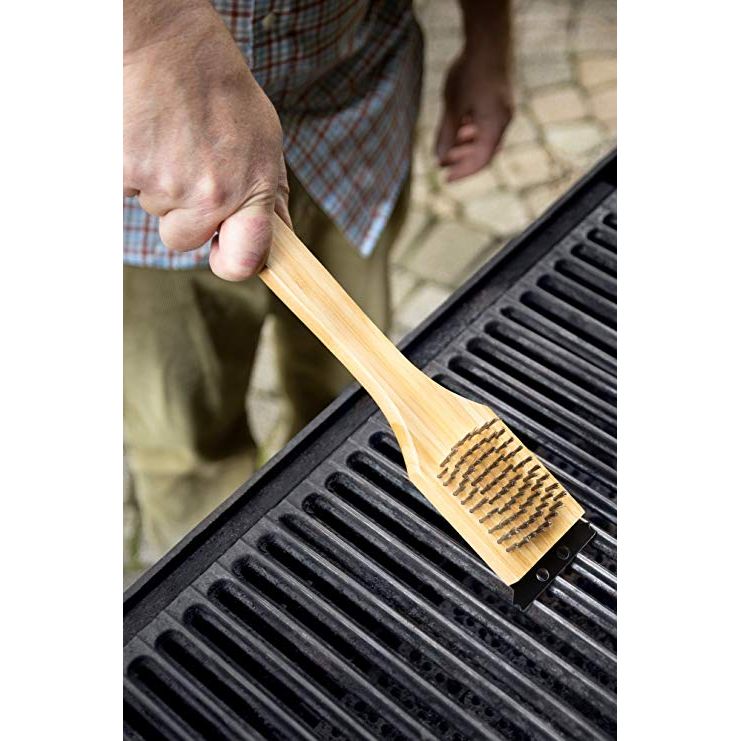 Une brosse à barbecue 100% durable qui s'attaque à la graisse et aux résidus tenaces. Grattoir en acier inoxydable recyclé avec manche en bambou. Le bord du racloir élimine les accumulations, les poils épais de la brosse nettoient sans rayer. La boucle en métal, un moyen pratique de la stocker lorsque vous ne l'utilisez pas.