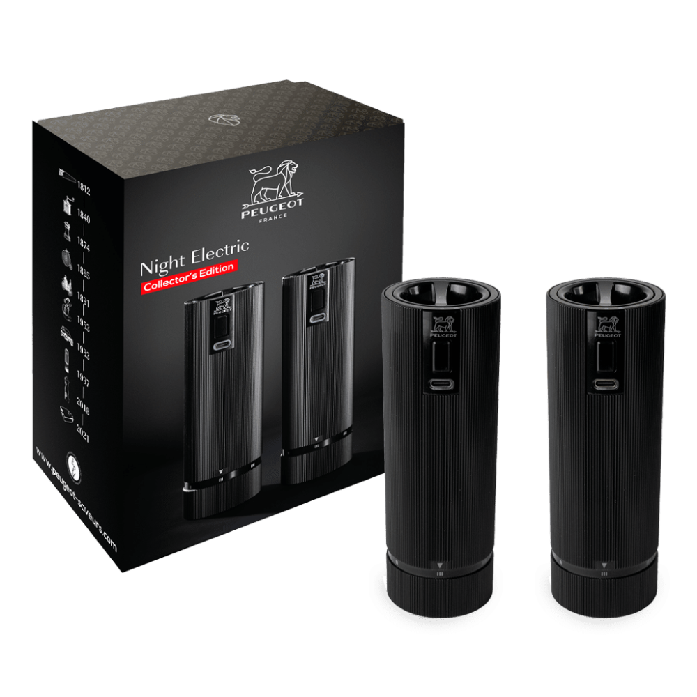 - Ce coffret se compose d’un moulin à poivre et d’un moulin à sel Night Electric noir mat 15 cm, d’un sachet échantillon de poivre noir et d’un sachet de sel sec (sel gemme)