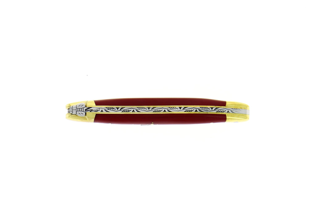 Couteau Forge de Laguiole en tissu compressé rouge composé d'une lame en acier Français. Il dispose de deux mitres en laiton qui protègent les extrémités du manche d'un usage quotidien.