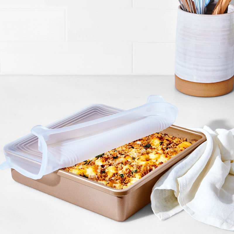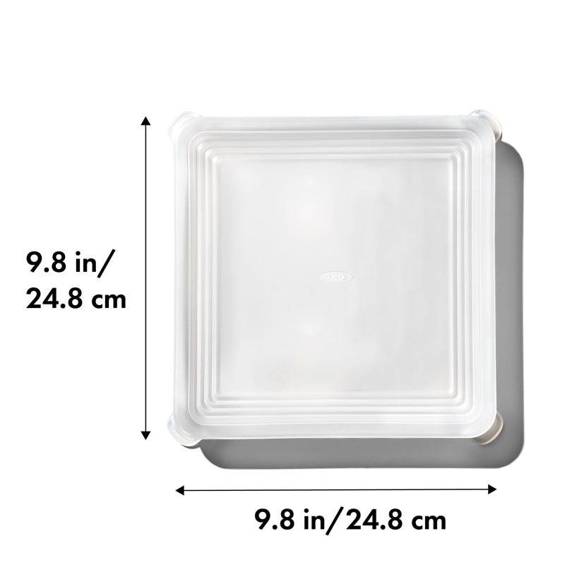 Découvrez une solution polyvalente pour réfrigérer, conserver et transporter vos délicieuses créations de boulangerie et de pâtisserie. Ce couvercle en silicone innovant remplace le film alimentaire à usage unique et le papier d'aluminium, offrant un joint étanche autour de vos plats de cuisson pour une fraîcheur durable. Son design solide permet même d'empiler d'autres aliments sur le dessus, optimisant l'espace de stockage dans votre réfrigérateur. Conçu spécifiquement pour s'adapter aux moules à pâtisserie en métal OXO Non-Stick Pro de 9 po x 9 po/23 cm x 23 cm, ce couvercle transparent s'harmonise parfaitement avec votre cuisine tout en offrant un rangement facile grâce à son adaptation au fond du moule.
