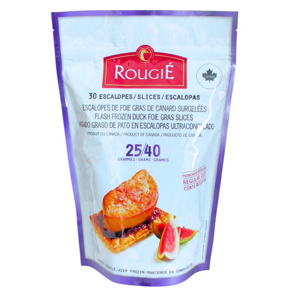 Les escalopes de foie gras Rougié sont les seules à être surgelées immédiatement après l'abattage. Elles ont un taux de fonte inférieur à 10% et un goût identique au foie gras réfrigéré. De plus, elles sont idéales pour les réceptions puisqu'on peut les poêler directement et réchauffer au four juste avant de servir.