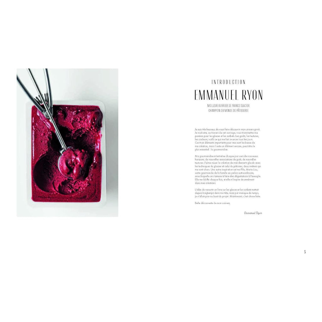 EMMANUEL RYON, Champion du Monde de Pâtisserie et Meilleur Ouvrier de France glacier, nous fait découvrir l’univers gastronomique étonnant et créatif de la glace, un monde où tout est possible et gourmand. Histoire de la glace et conseils techniques accompagnent crèmes glacées et sorbets, gâteaux de voyage, fruits givrés, esquimaux, granités, yaourts, desserts glacés, mais aussi macarons et boissons. Des goûts les plus classiques aux plus singuliers, tout l’art de la glace y est sublimé au travers des 60 recettes élégantes mais accessibles proposées par le chef. Crème glacée vanille ou topinambour, sorbet pétales de roses ou abricot verveine, financier noisette sorbet framboise poivron, tomate givrée, milk-shake coco thé matcha, chouquette glacée, macaron curcuma sorbet mangue… Une multitude de délices glacés qui vous feront fondre de plaisir !