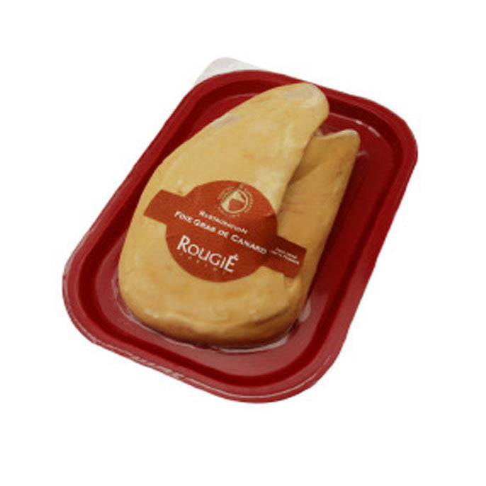 Le lobe entier de Foie Gras rougié est fait de canard Mulard. Son poids oscille entre 500 et 800g. Aussitôt sortis du coffre du canard, les foies passent au surgélateur à l'azote liquide pour figer les molécules de graisse en quelques minutes. Le goût et la qualité des foies sont égaux au 1er jour, et ils rendent 20 à 30% moins de gras qu'un lobe réfrigéré classique.