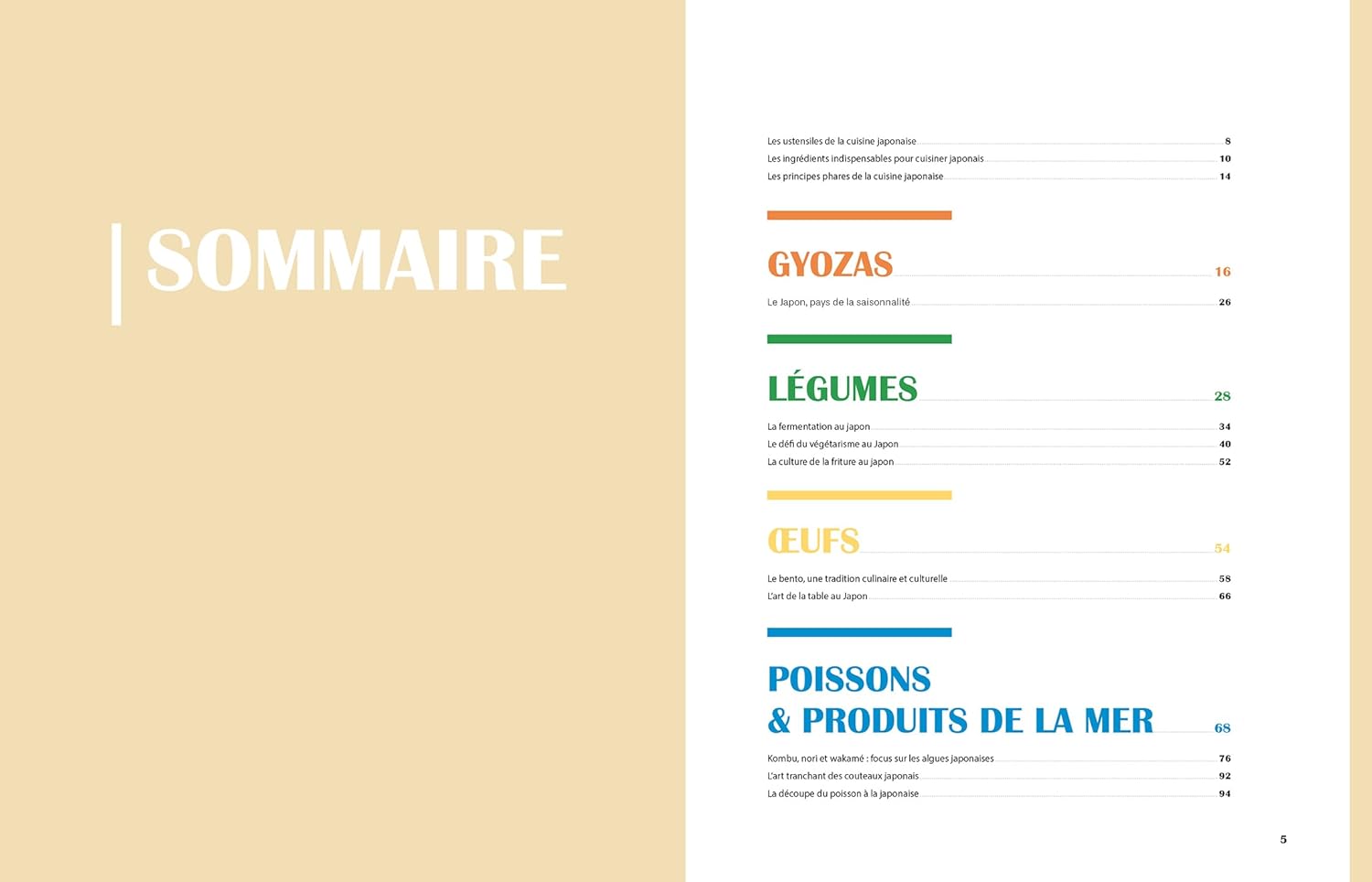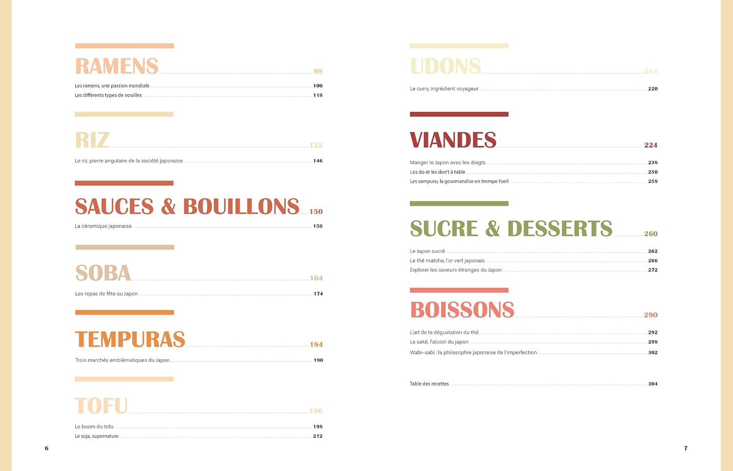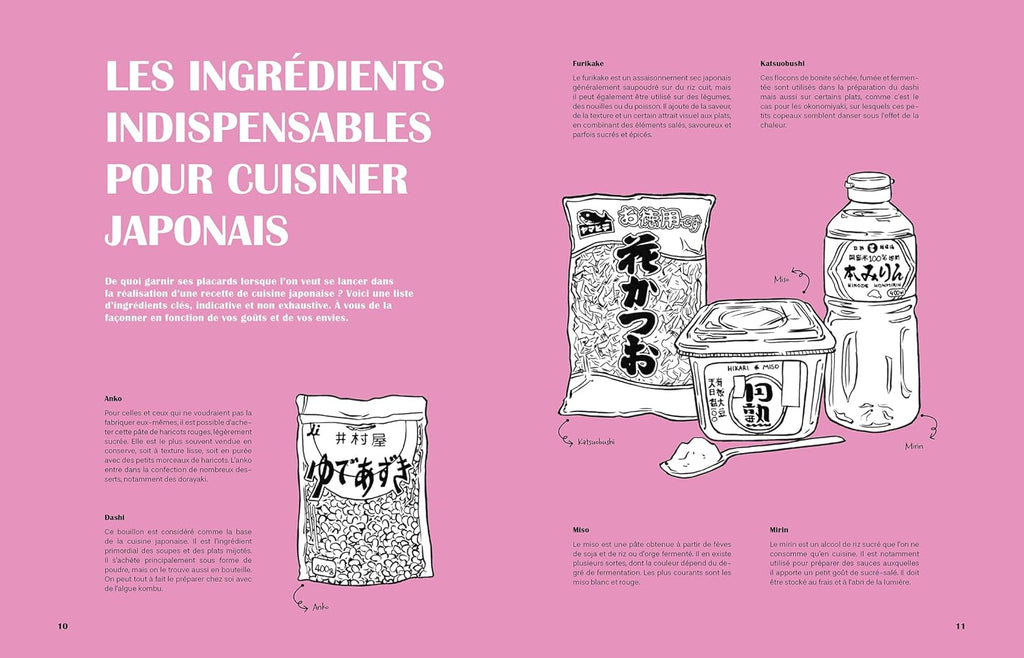 40 focus culturels détaillés : le miso, le soja, la céramique japonaise, les ben to, la fermentation, la cuisine végétarienne au Japon, les différents types de couteaux, le matcha, l’art de la table, les repas de fête, le saké...