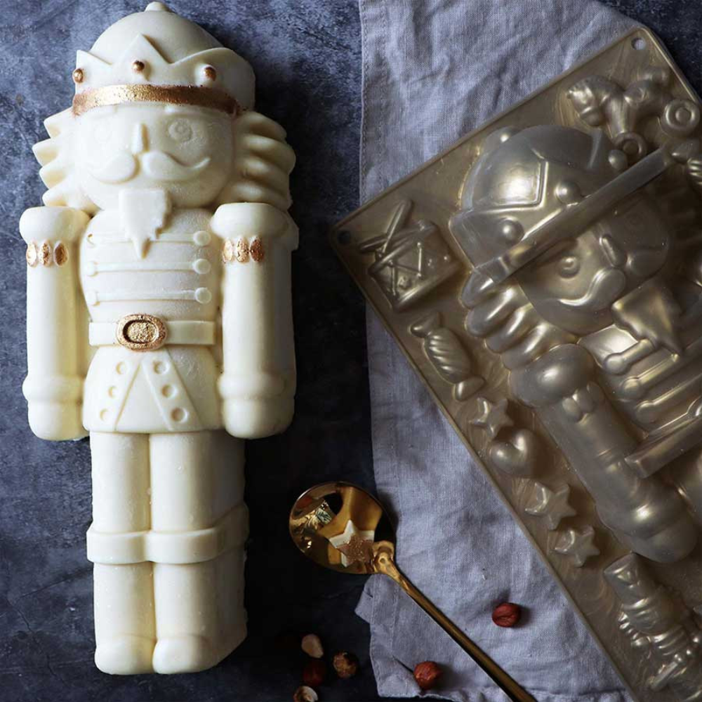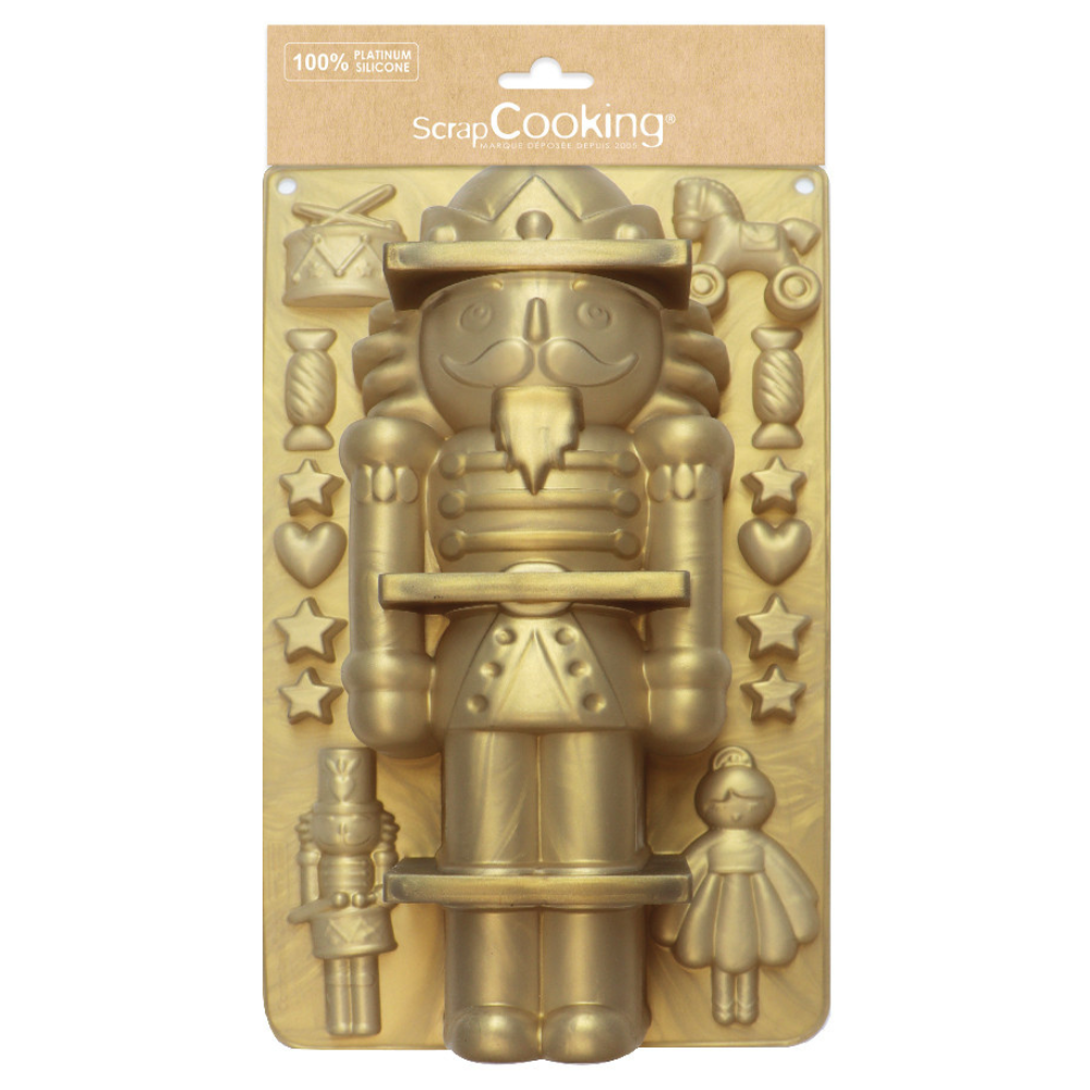 MOULE SUR UN THÈME CASSE-NOISETTE : Ce moule en silicone au coloris doré sera idéal pour les fêtes de fin d'année & parfait pour tous les amateurs de pâtisserie et de chocolats ! Ajoutez une touche d'originalité à vos créations et brillez lors du repas de Noël ! Le moule principal représente le légendaire Casse-Noisette, tandis que les autres cavités sont en forme de danseuse, de bonbon, de tambour, de cheval à bascule, d'étoile et de cœur et vous permettront de réaliser des petits chocolats supplémentaires.