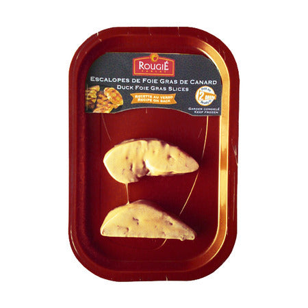 Les escalopes de foie gras Rougié sont les seules à être surgelées immédiatement après l'abattage. Elles ont un taux de fonte inférieur à 10% et un goût identique au foie gras réfrigéré. De plus, elles sont idéales pour les réceptions puisqu'on peut les poêler directement et réchauffer au four juste avant de servir.