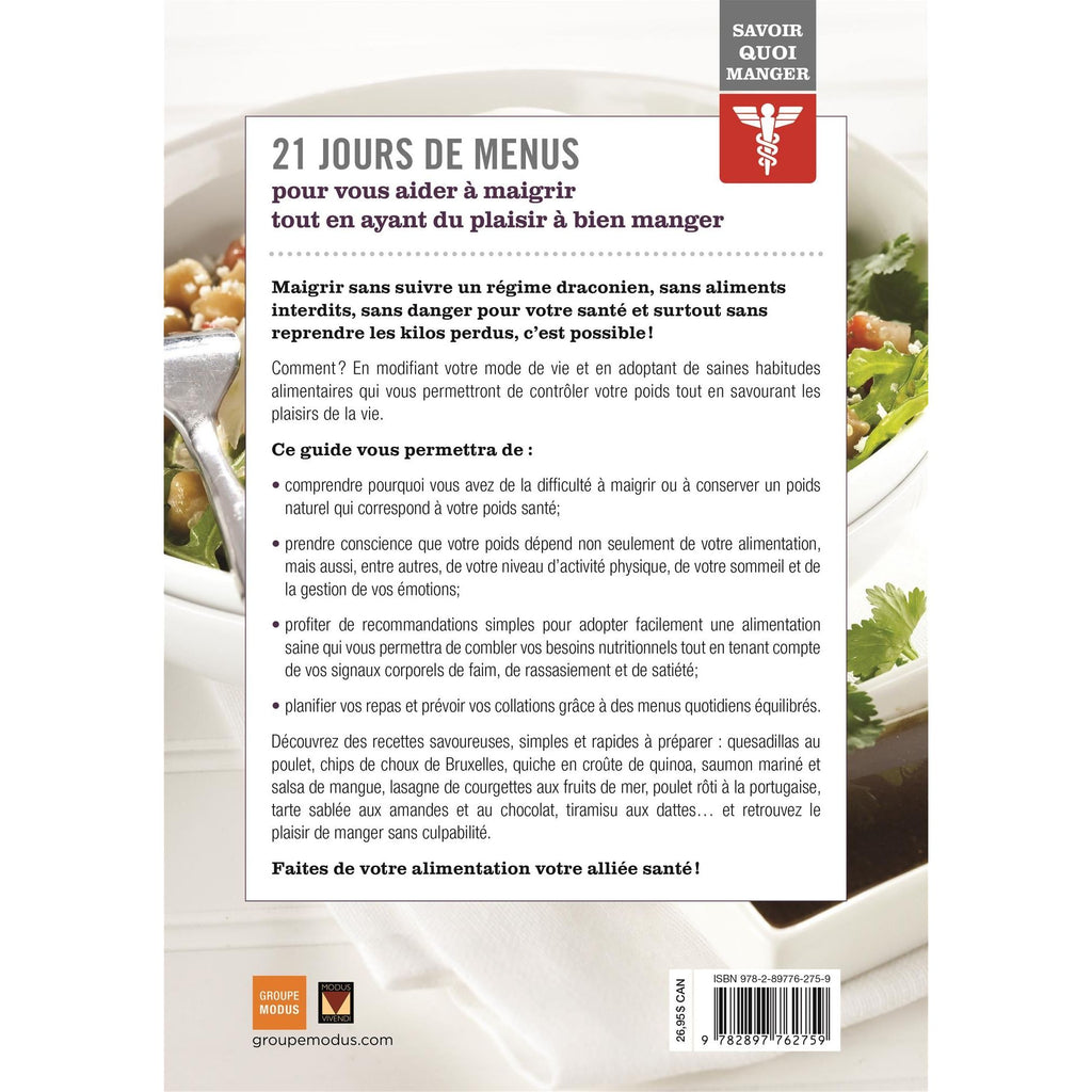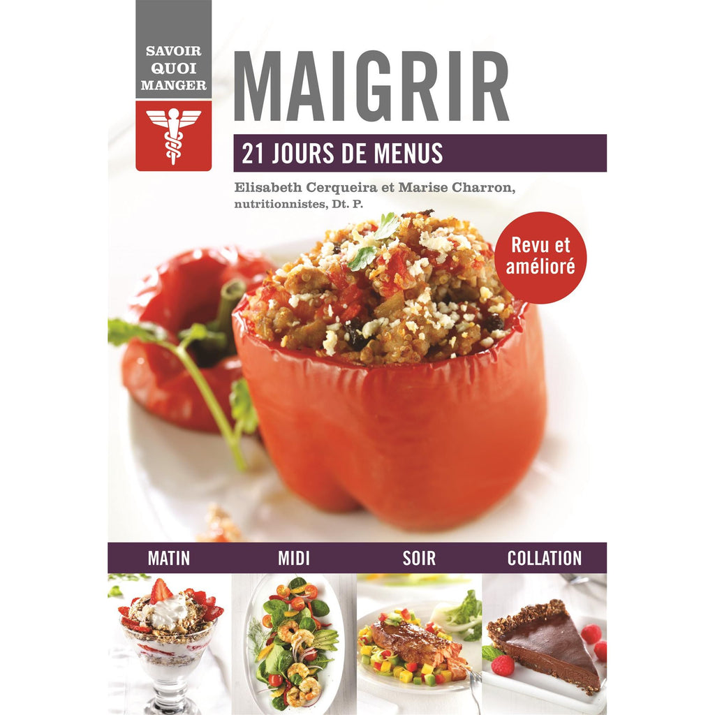 Savoir quoi manger – Maigrir, un ouvrage qui propose 21 jours de menus pour vous aider à maigrir tout en ayant du plaisir à bien manger.