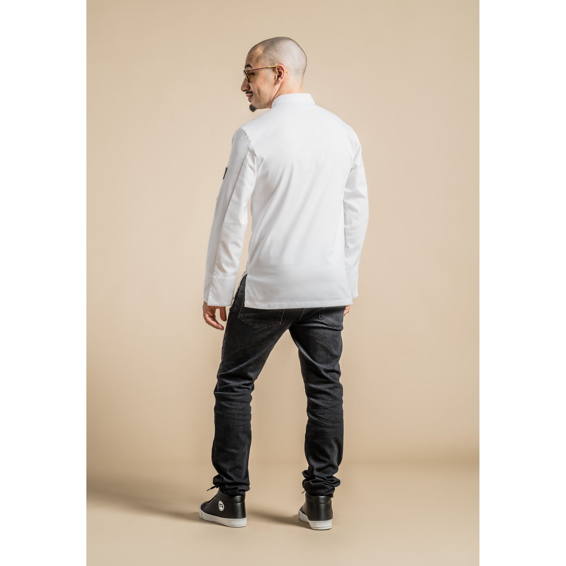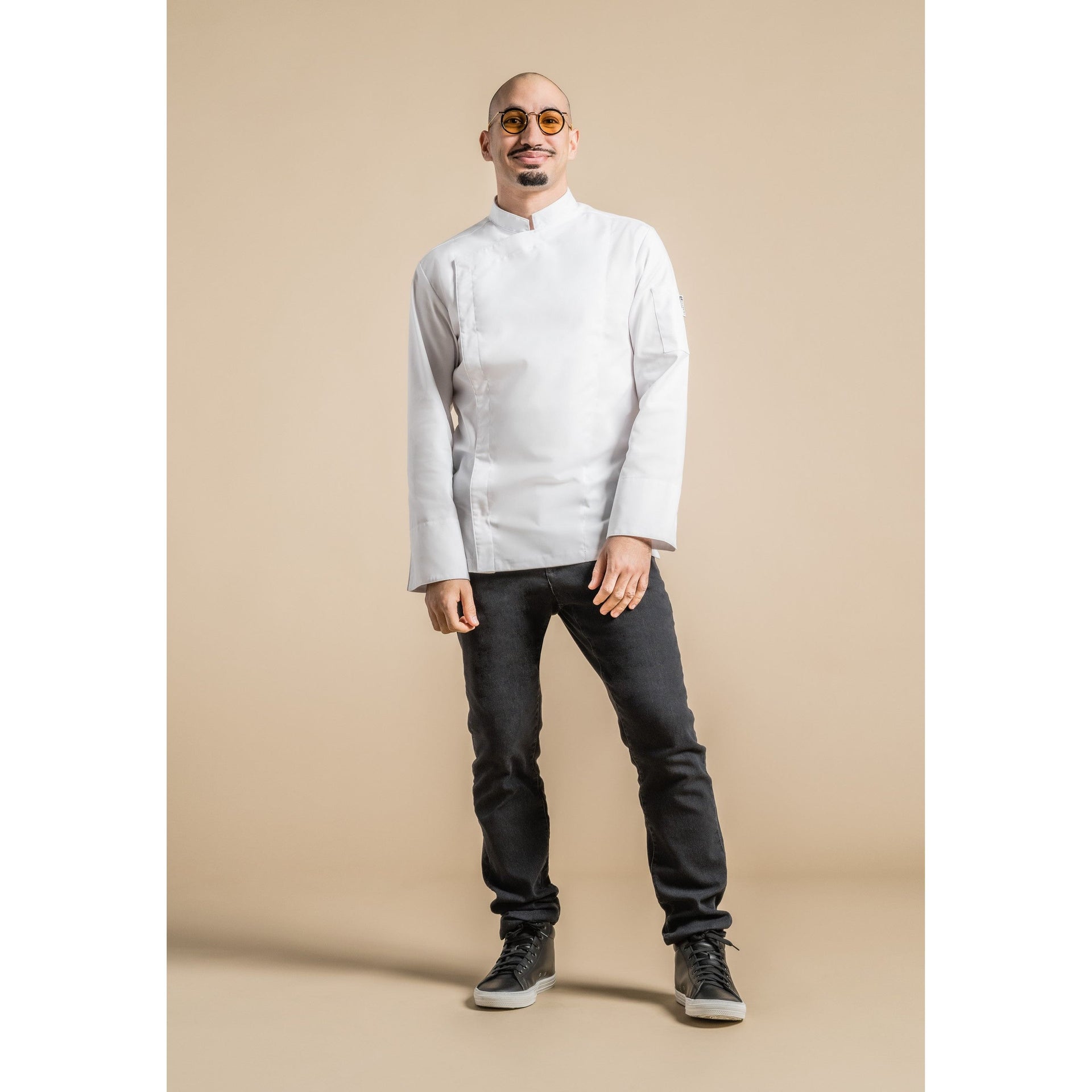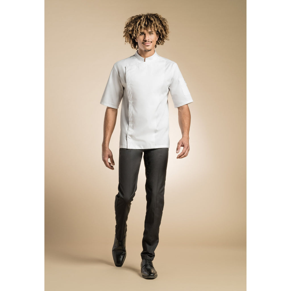 Veste de cuisine homme. Col officier carré, pressions cachées, poche stylo manche gauche, fentes côtés. Tissu 65% polyester 35% coton. Disponible en manches courtes ou longues de la taille XS (T00) à 6XL (T8).